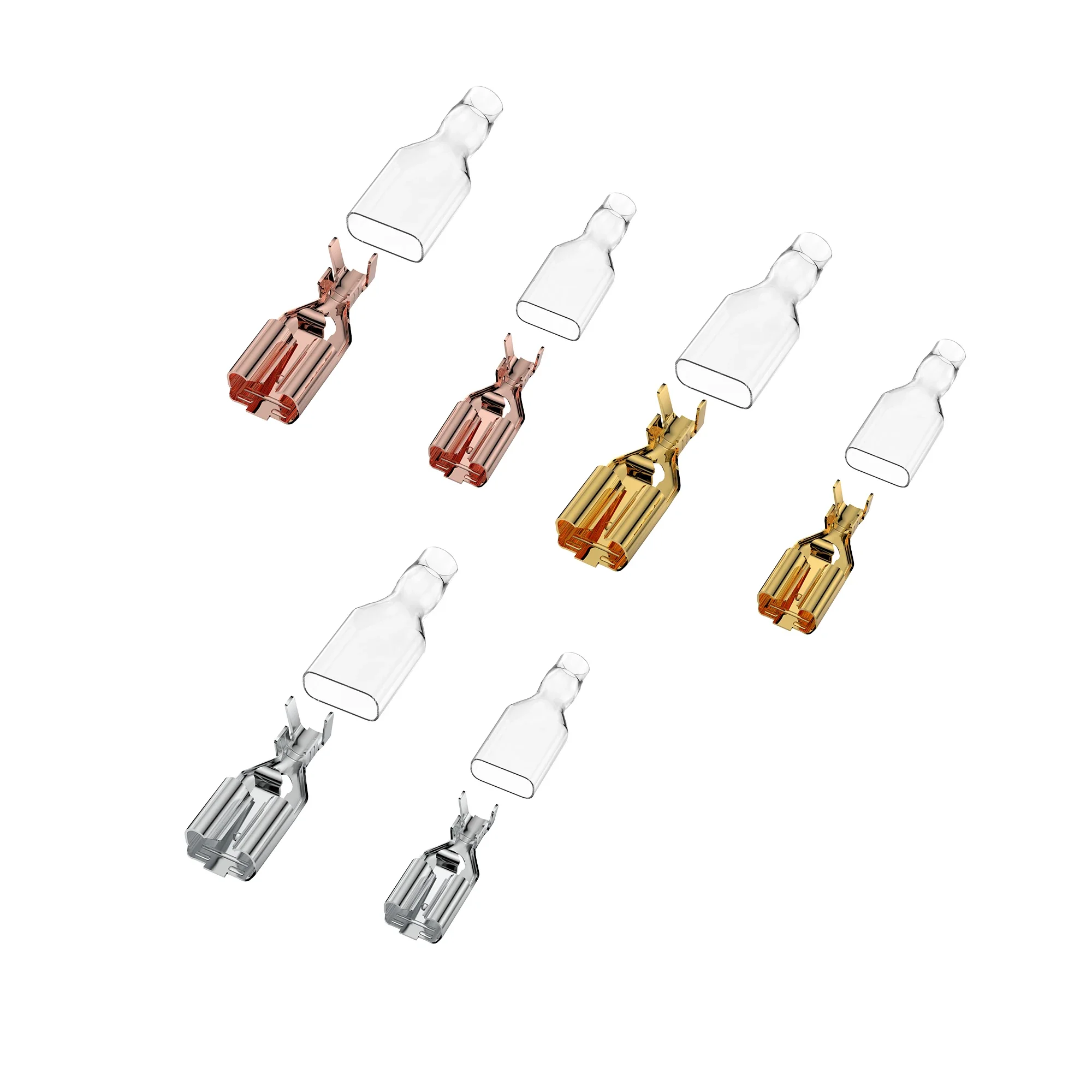 Transform your speaker wiring projects with this high-quality push-on cable shoe set, designed for reliable IEC connections. Crafted with 99.998% pure copper, these connectors feature a sleek, polished metallic finish in gold or rhodium plating, ensuring both durability and an elegant look. Their flat, rectangular shape and smooth edges contribute to a minimalist, modern style that complements any audio setup. With transparent insulation covers included, they provide excellent protection while maintaining a refined aesthetic. Whether you're upgrading or repairing, these crimp sleeves are ideal for secure and efficient connections, offering peace of mind and professional results every time. Elevate your DIY audio work with connectors that combine style, function, and exceptional craftsmanship.