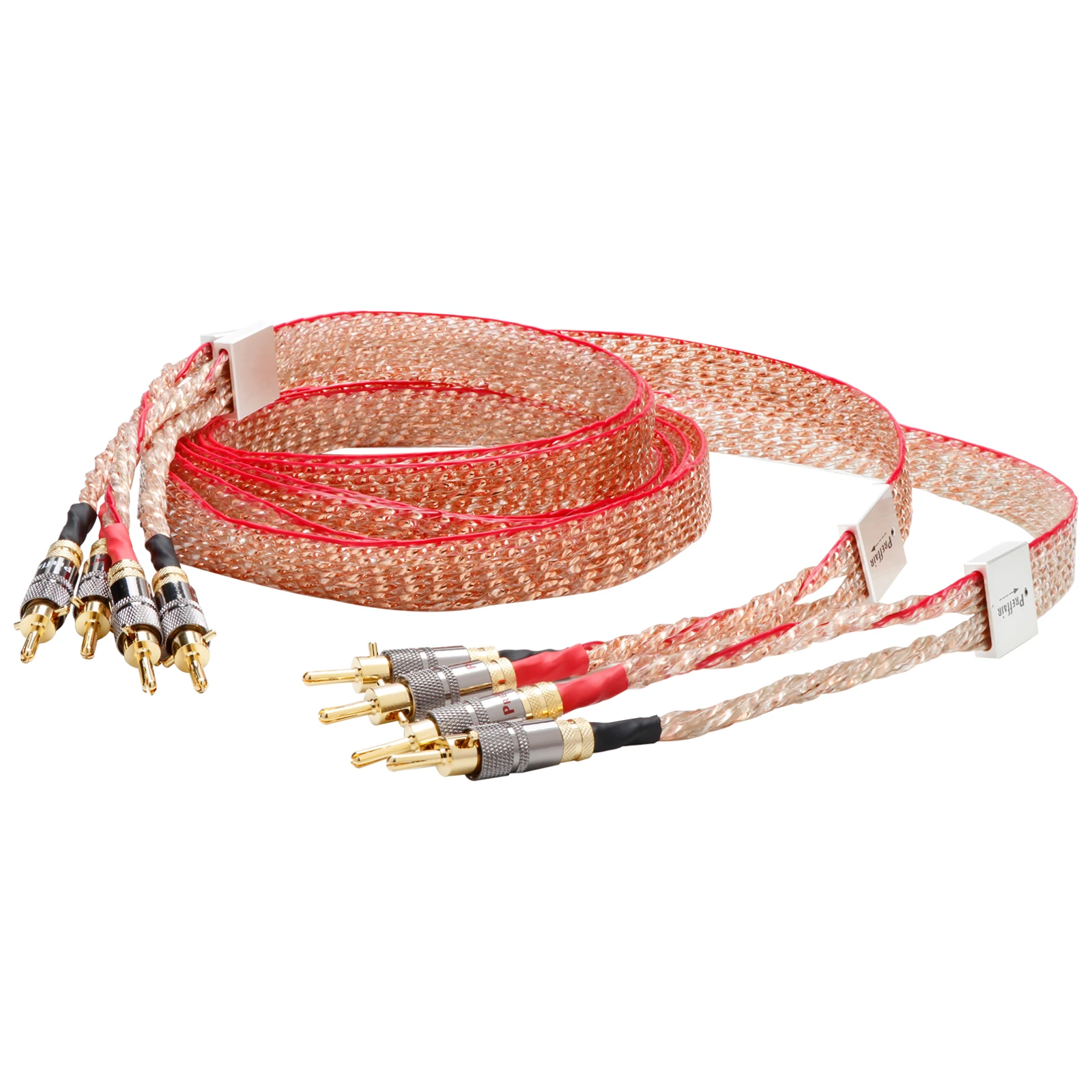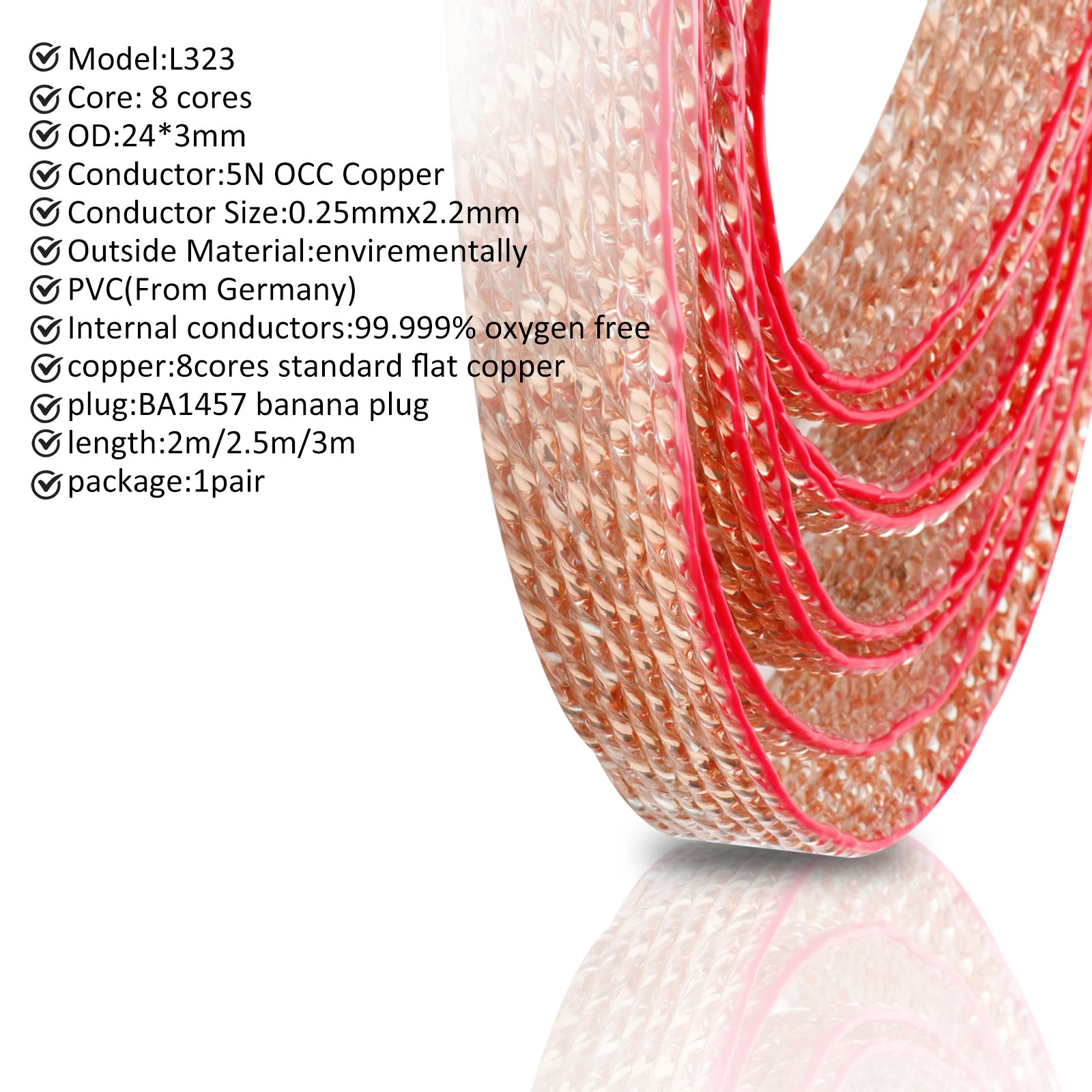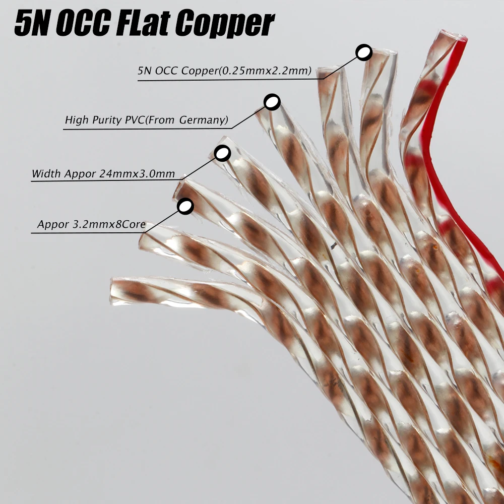 Experience exceptional audio clarity with this high-end flat speaker cable, designed to deliver pure sound quality for your home theater, KTV, or multimedia setup. Crafted with 5N OCC copper conductors, each containing eight identical flat wires of 0.25mm x 2.2mm, this cable ensures optimal conductivity and minimal signal loss. The transparent outer sheath showcases the sleek, silver-plated internal wiring, emphasizing precision and craftsmanship. Its flat profile, with an outside diameter of approximately 24mm, offers flexibility and easy installation. Equipped with durable, gold-plated self-locking banana plugs (model BA1457), the setup guarantees secure connections and high durability. Ideal for audiophiles seeking impeccable audio performance and a modern aesthetic.
