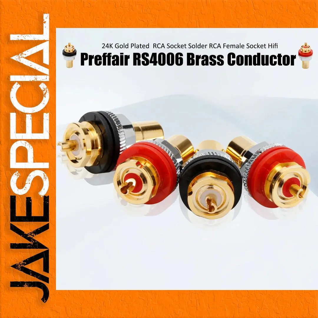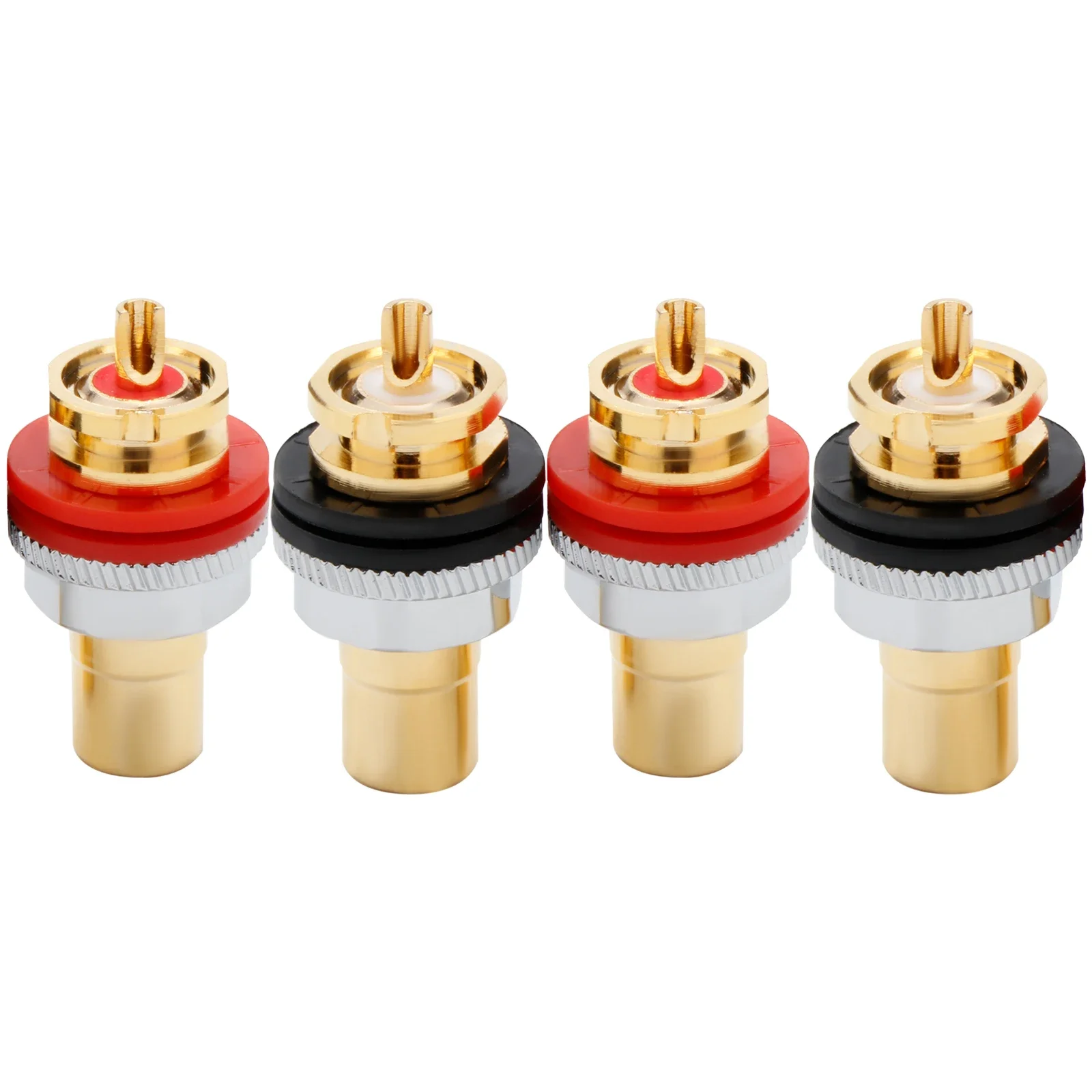 Experience premium sound and video quality with this high-performance RCA female socket, model RS4006, featuring pure copper construction with 24-karat gold plating for excellent conductivity and corrosion resistance. Designed for high-end HiFi audio, video, TV, CD, and amplifier applications, it offers a sleek, cylindrical shape with a reflective gold exterior, contrasting silver-colored metallic ring, and knurled threaded base for secure mounting. Equipped with PVC (red and white) and PETF insulation for versatile panel thickness compatibility, this durable connector is solderable, RoHS certified, and available in sets of 2 or 4 pieces, ensuring reliable and enduring connections for your equipment.