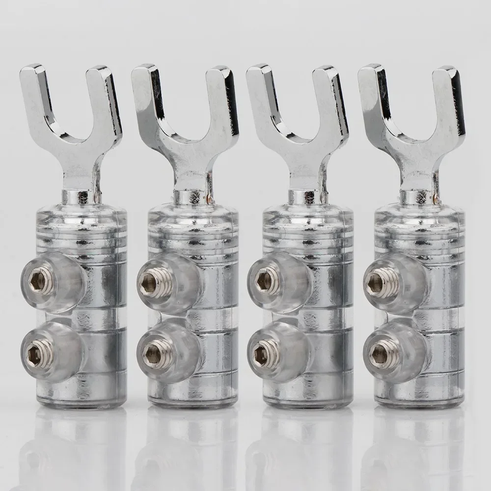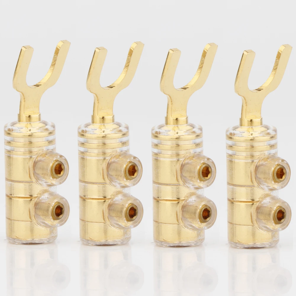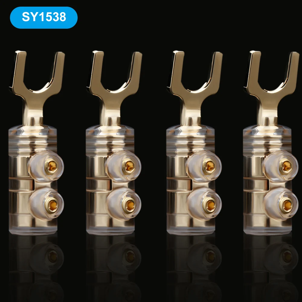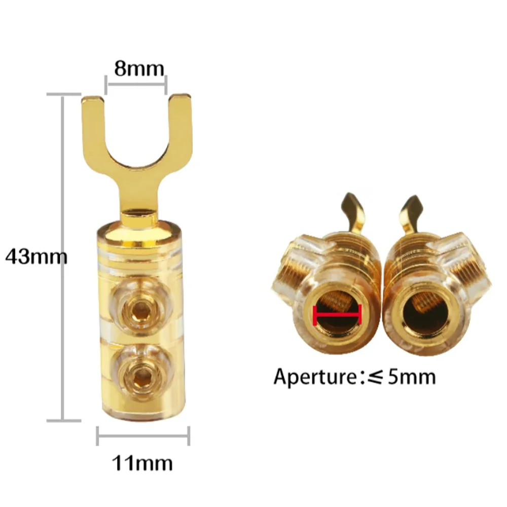 Enhance your high-fidelity audio setup with this set of four premium Y spade terminals, crafted from pure copper for superior conductivity. Each terminal measures 42mm in height with a 14mm outer diameter, designed for easy connection to speaker cables with diameters up to 4.2mm. These screw-locked banana Y spade plugs offer a sleek, polished gold finish, ensuring durability and corrosion resistance while providing a premium aesthetic. Compatible with male speaker wall plates, they feature soldered connections that do not require additional soldering, making installation straightforward. Available in two stylish color options, these Y spade terminals deliver reliable, high-performance connections for sophisticated audio systems.