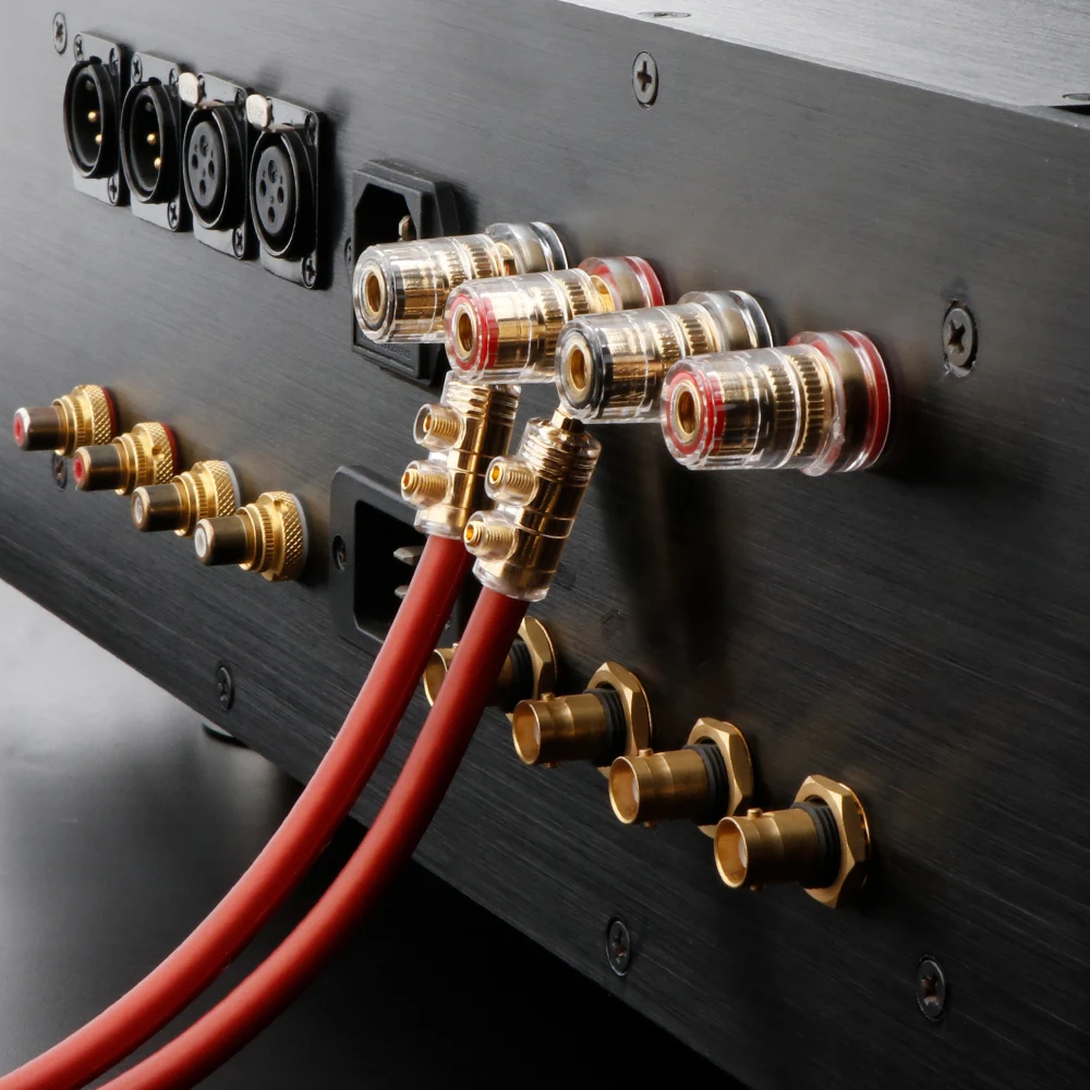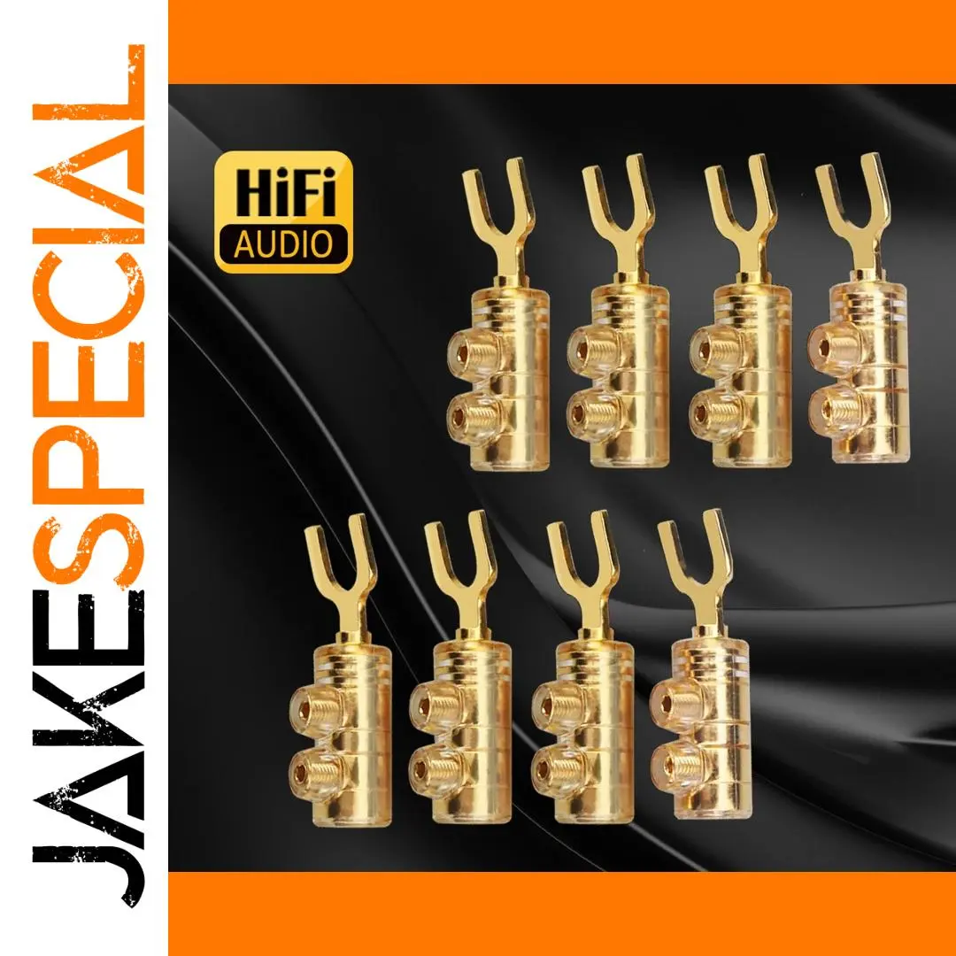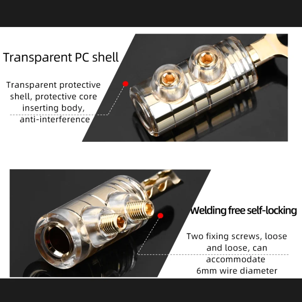 Enhance your high-fidelity audio setup with this set of four premium Y spade terminals, crafted from pure copper for superior conductivity. Each terminal measures 42mm in height with a 14mm outer diameter, designed for easy connection to speaker cables with diameters up to 4.2mm. These screw-locked banana Y spade plugs offer a sleek, polished gold finish, ensuring durability and corrosion resistance while providing a premium aesthetic. Compatible with male speaker wall plates, they feature soldered connections that do not require additional soldering, making installation straightforward. Available in two stylish color options, these Y spade terminals deliver reliable, high-performance connections for sophisticated audio systems.