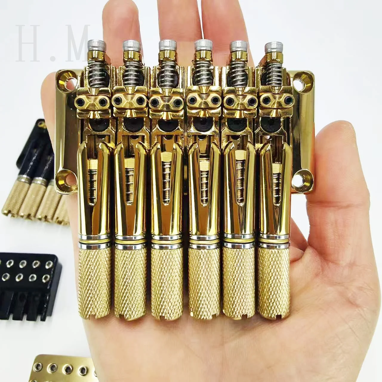 - The six-string saddles are gold-colored, featuring knurled ends for precise tuning and small screw adjustments on top, maximizing string stability and intonation accuracy during play.