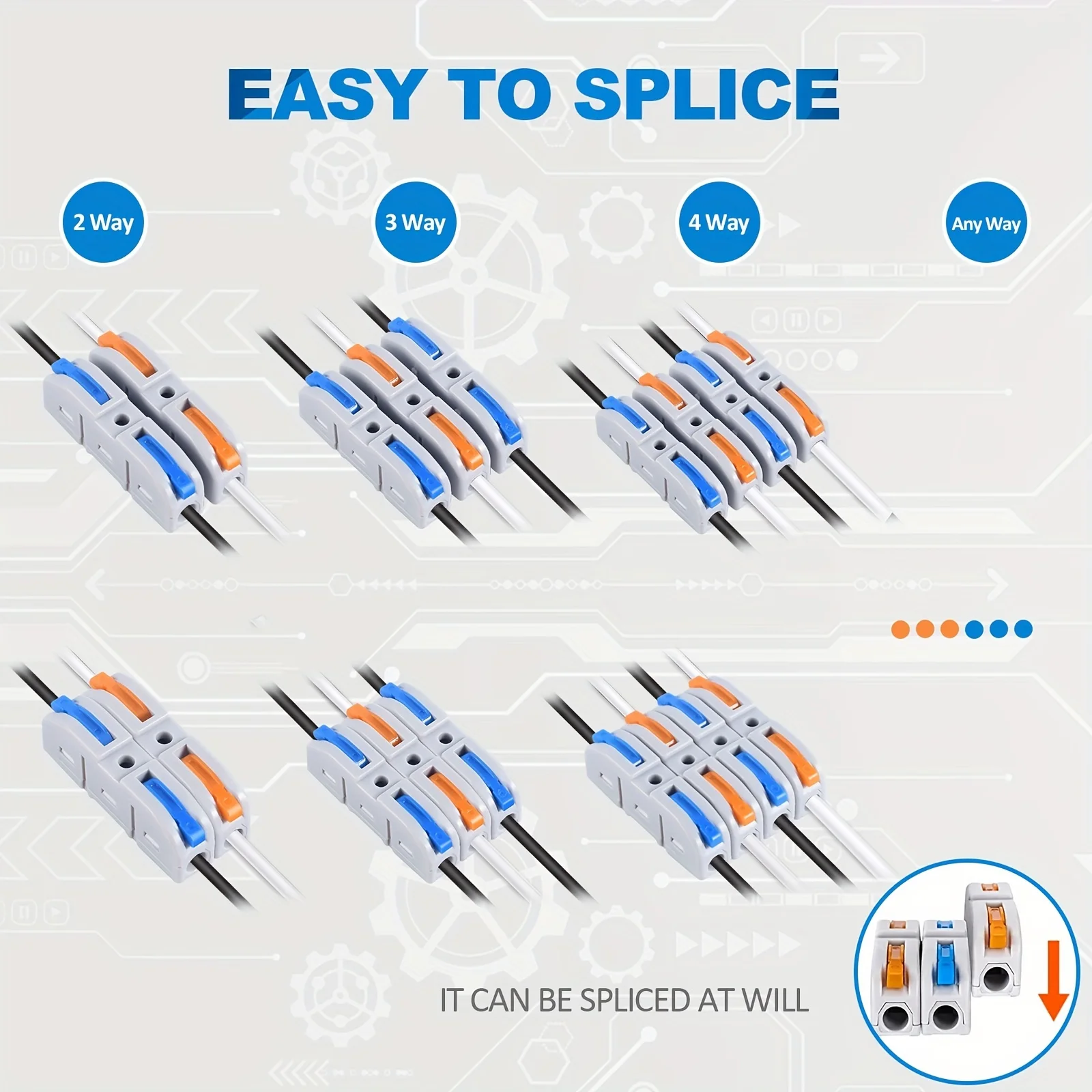 Imagine effortlessly connecting multiple electrical wires with this comprehensive set of inline wire connectors. Crafted for quick and tool-free installation, these connectors feature sleek, transparent plastic housings that reveal the inner components. The white bodies are accented with vibrant blue and orange locking tabs, making it easy to identify different circuits or phases. Designed with a minimalistic and ergonomic shape, these connectors ensure a snug fit and reliable connection in various wiring projects. Ideal for household, industrial, or automotive applications, this set brings organization and efficiency to your electrical tasks. Visualize your workspace clutter-free, your wiring secure, and your projects completed smoothly with these versatile, high-quality connectors.