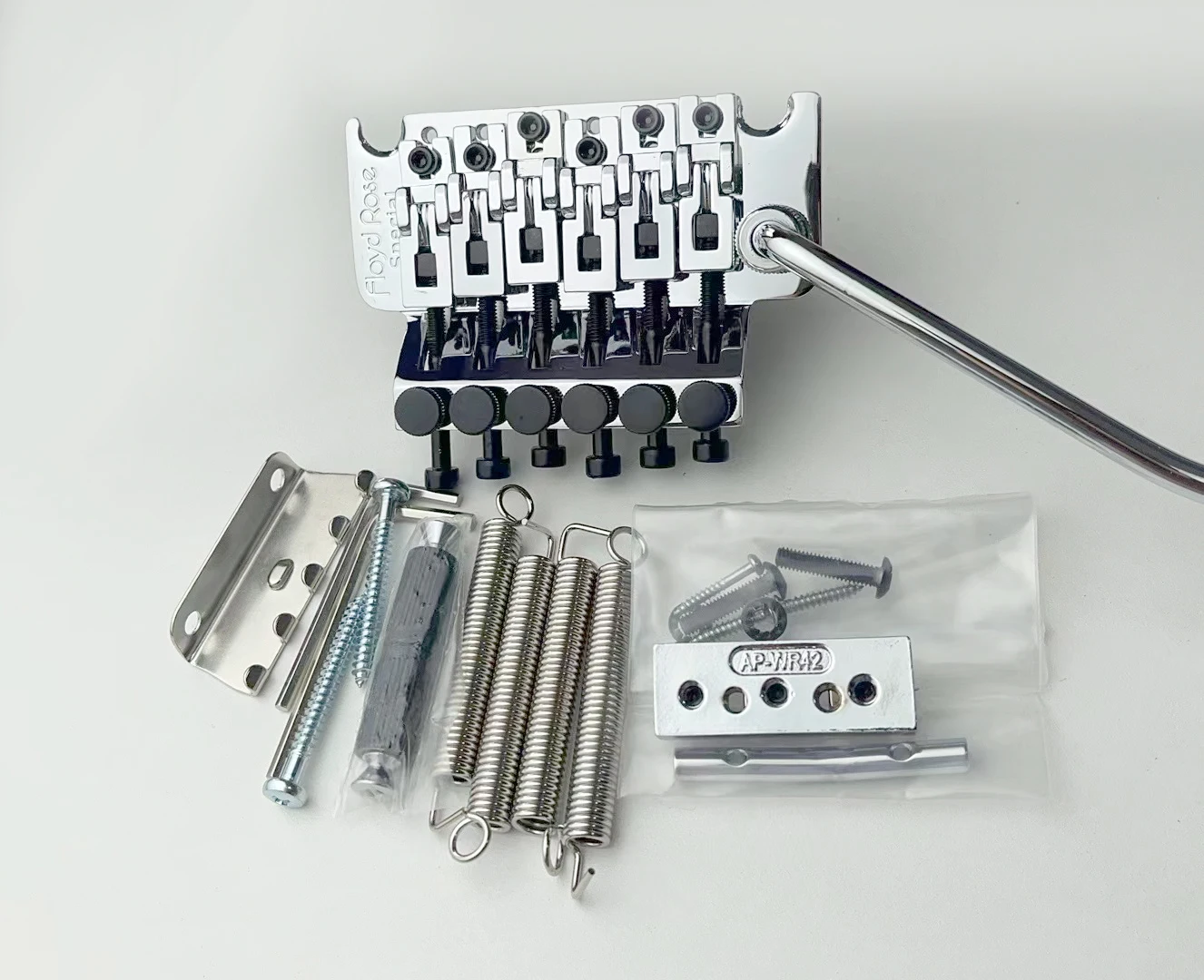 - Complete package features tremolo arm, two wrenches, locking nut, claw, screws, springs, and anchor studs for easy installation.
