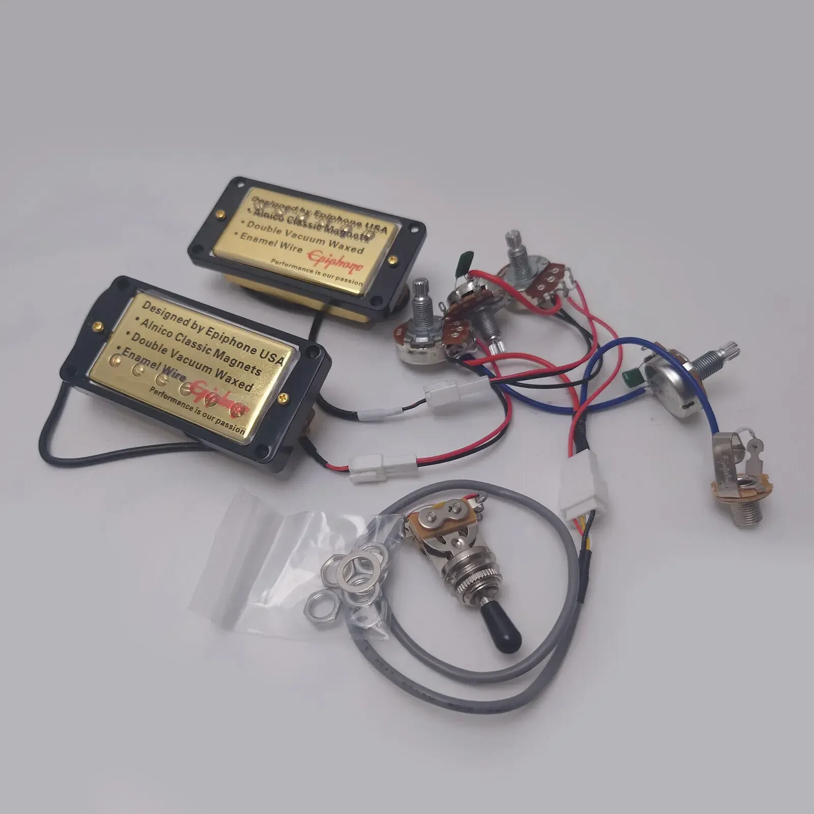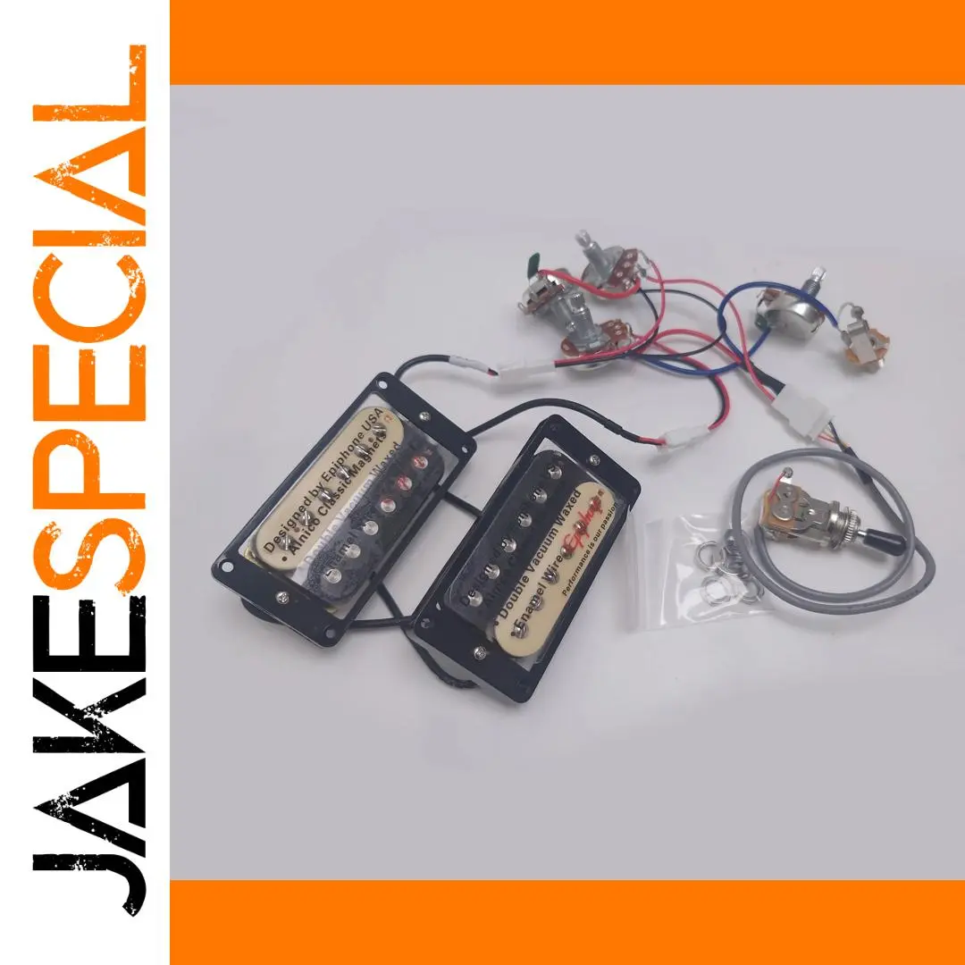 Transform your guitar's sound with this premium humbucker pickup set, designed to deliver warm, balanced tones perfect for enhancing your musical expression. The set includes two pickups—neck and bridge—with resistance ratings of 7.5K and 14.5K ohms, respectively. Their sleek black covers feature precisely etched text, adding a vintage-inspired, minimalist charm while ensuring durability. The included wiring harness offers an effortless solder-free installation via quick-connect terminals, making upgrades hassle-free. With a comprehensive setup including a 3-speed toggle switch, four 500K ohm potentiometers, and a jack socket tailored for 2V2T configurations, this kit is ideal for replacing or upgrading your LP guitar pickups. Available in multiple vibrant colors, it allows your instrument to match your style seamlessly.