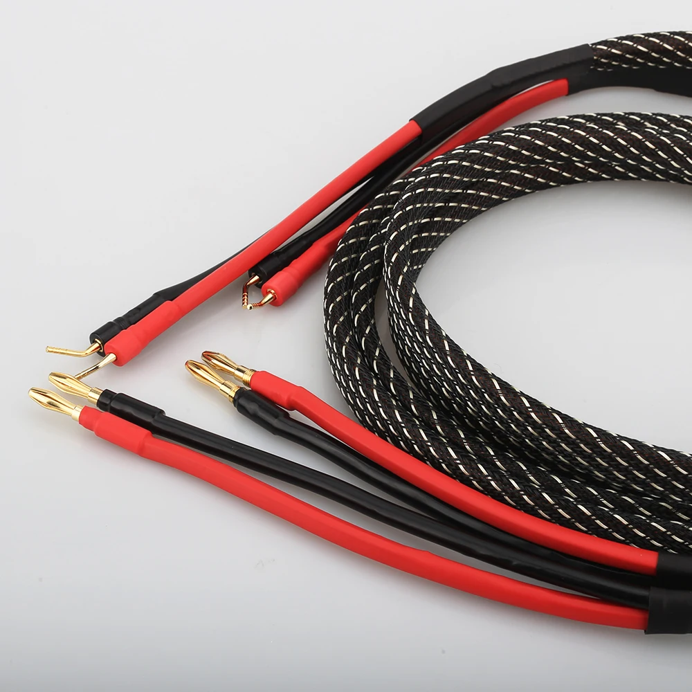 Experience premium sound connection with this high-quality speaker cable, designed for audiophiles who demand durability and superior audio transmission. Featuring pure copper conductors (OFC), it offers enhanced conductivity and minimal signal loss. The sleek design combines minimalist smooth black sheaths with textured black and white braided strands, creating a visually appealing and professional look. Equipped with shiny gold-plated banana and pin connectors, this cable looks as good as it performs, ensuring optimal conductivity and corrosion resistance. Ideal for connecting loudspeakers to amplifiers in high-fidelity audio setups, this cable provides reliability, elegance, and unmatched sound clarity. Its versatile lengths—ranging from 2.0 to 5 meters—allow customization for any room setup, elevating your listening experience.