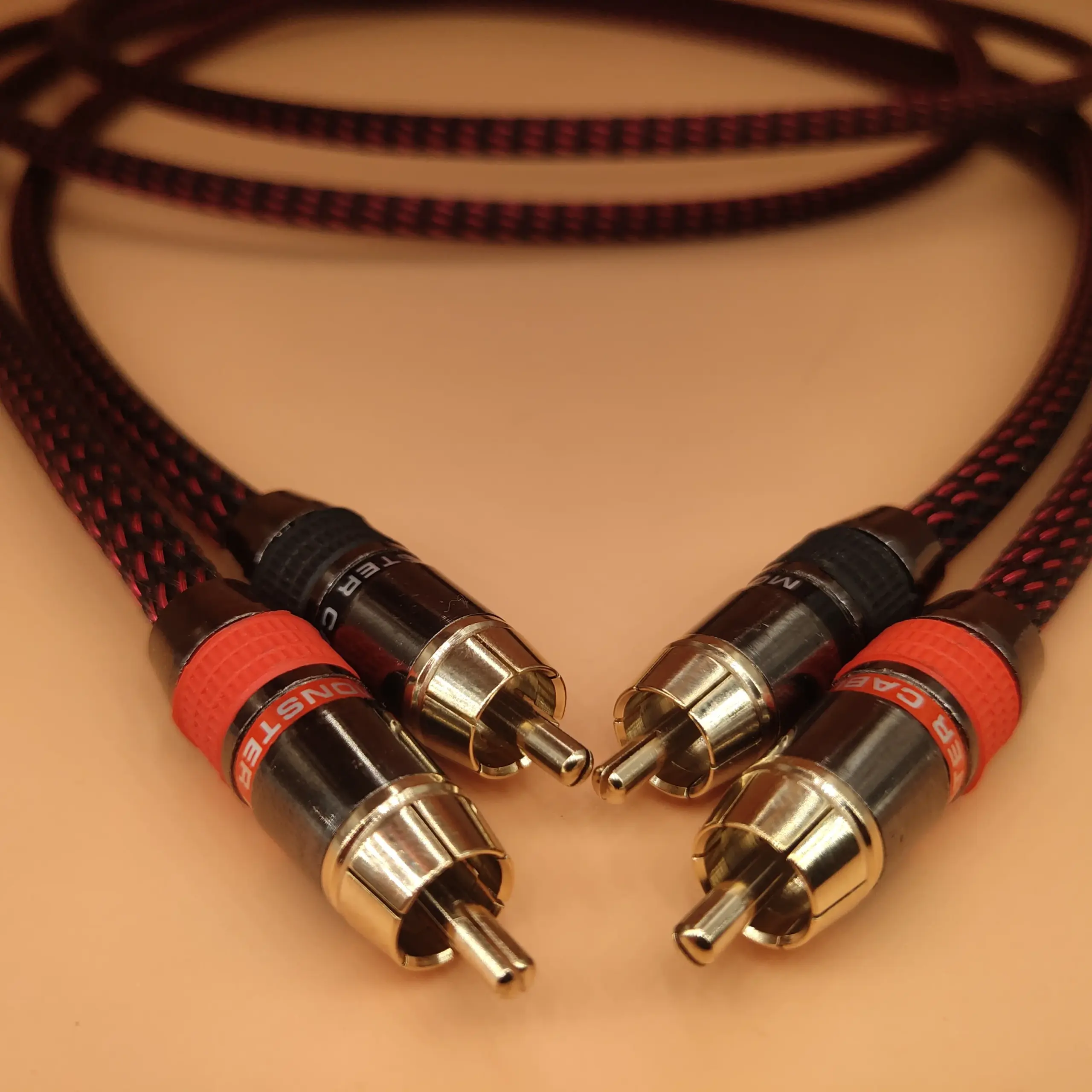 Imagine elevating your high-fidelity sound system with this this premium RCA audio cable, designed for audiophiles and enthusiasts who demand crystal-clear audio. Crafted with meticulous attention to detail, it features shiny, gold-plated connectors that offer excellent conductivity and corrosion resistance. The cable's thick, braided outer sheath in black and red not only adds to its rugged, professional look but also provides durability and flexibility. Designed to minimize interference, this cable ensures pure, noise-free sound, perfect for connecting your power amplifier or high-end audio equipment. Whether for professional studio use or premium home audio setups, this cable promises exceptional performance and a refined aesthetic, bringing your music to life with clarity and precision.