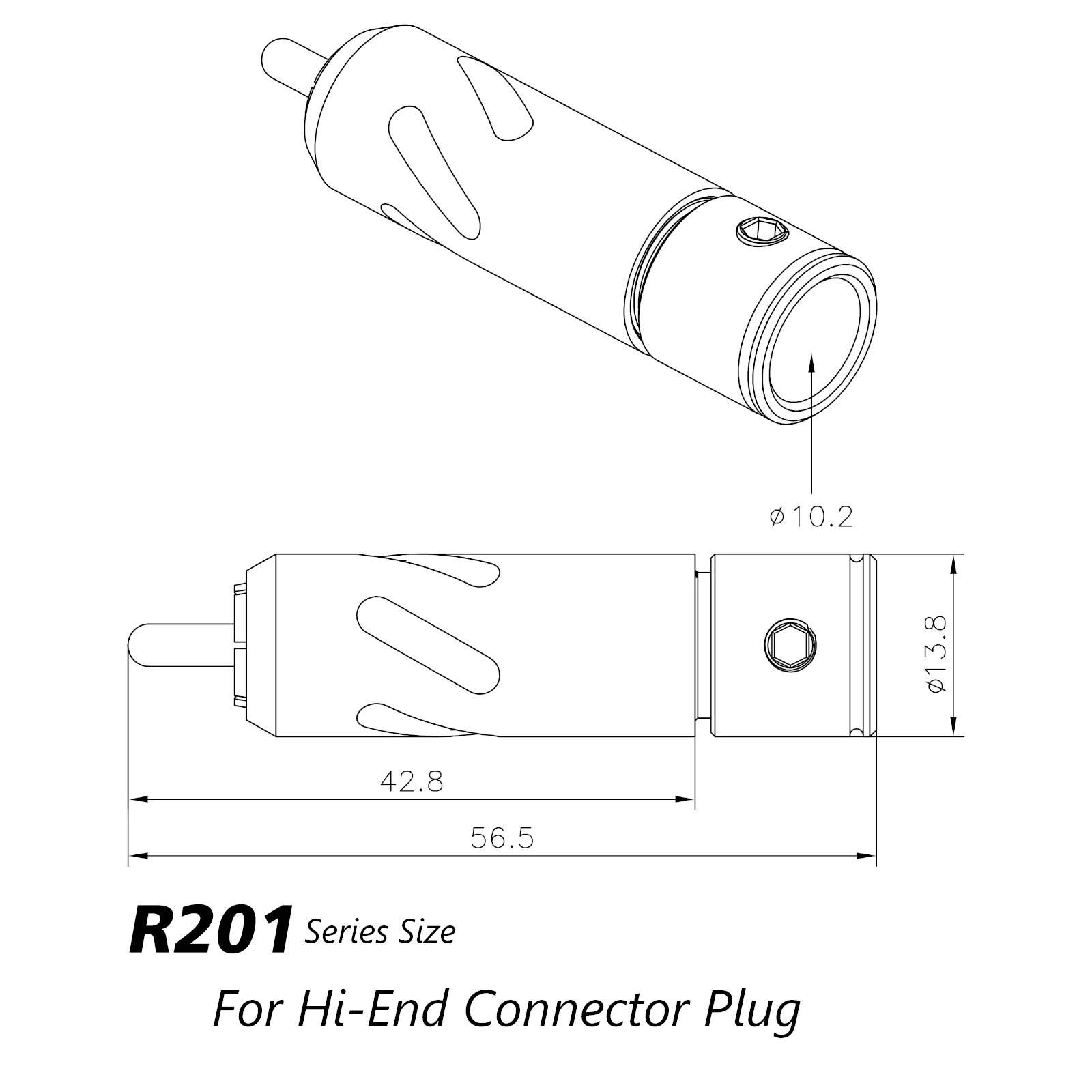 Experience superior sound quality with this meticulously crafted RCA connector. Designed for audiophiles and professionals alike, it features a sleek, cylindrical metal housing with a reflective chrome finish that adds elegance to your setup. The connector’s pure copper conductor ensures maximum conductivity, while its polished brass exterior enhances durability and aesthetic appeal. Available in three variants—R201, R201G, and R201R—it offers versatility for different high-end audio applications. The 56.5mm length and 10.2mm hole size are compatible with cables up to 10mm in diameter. With a solder connection method, this connector guarantees a secure, reliable connection, making it the ideal upgrade for discerning audio enthusiasts looking for top-tier sound performance and refined style.