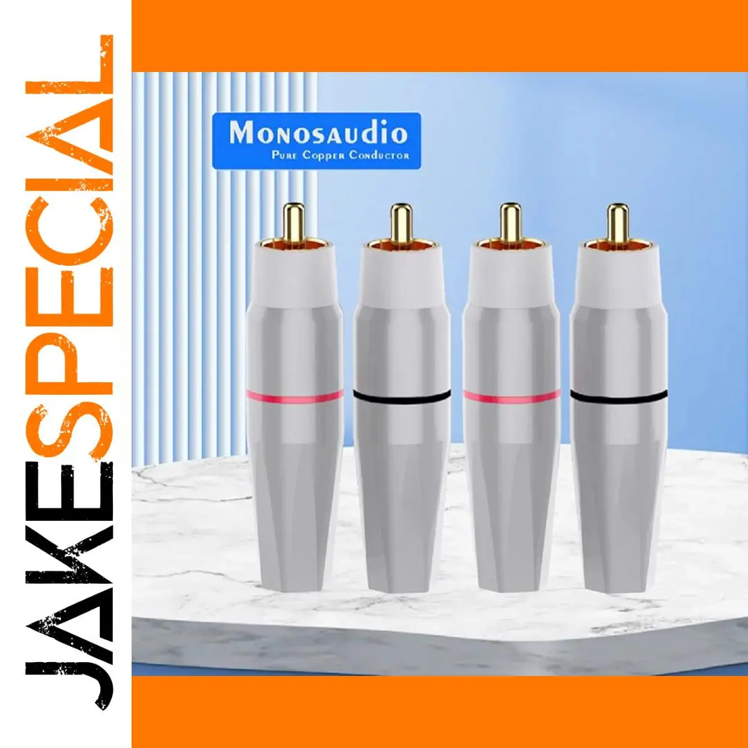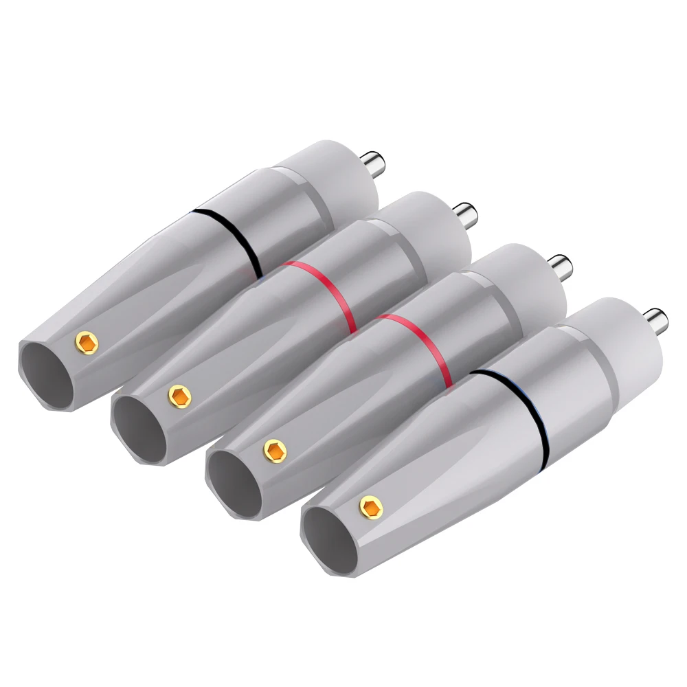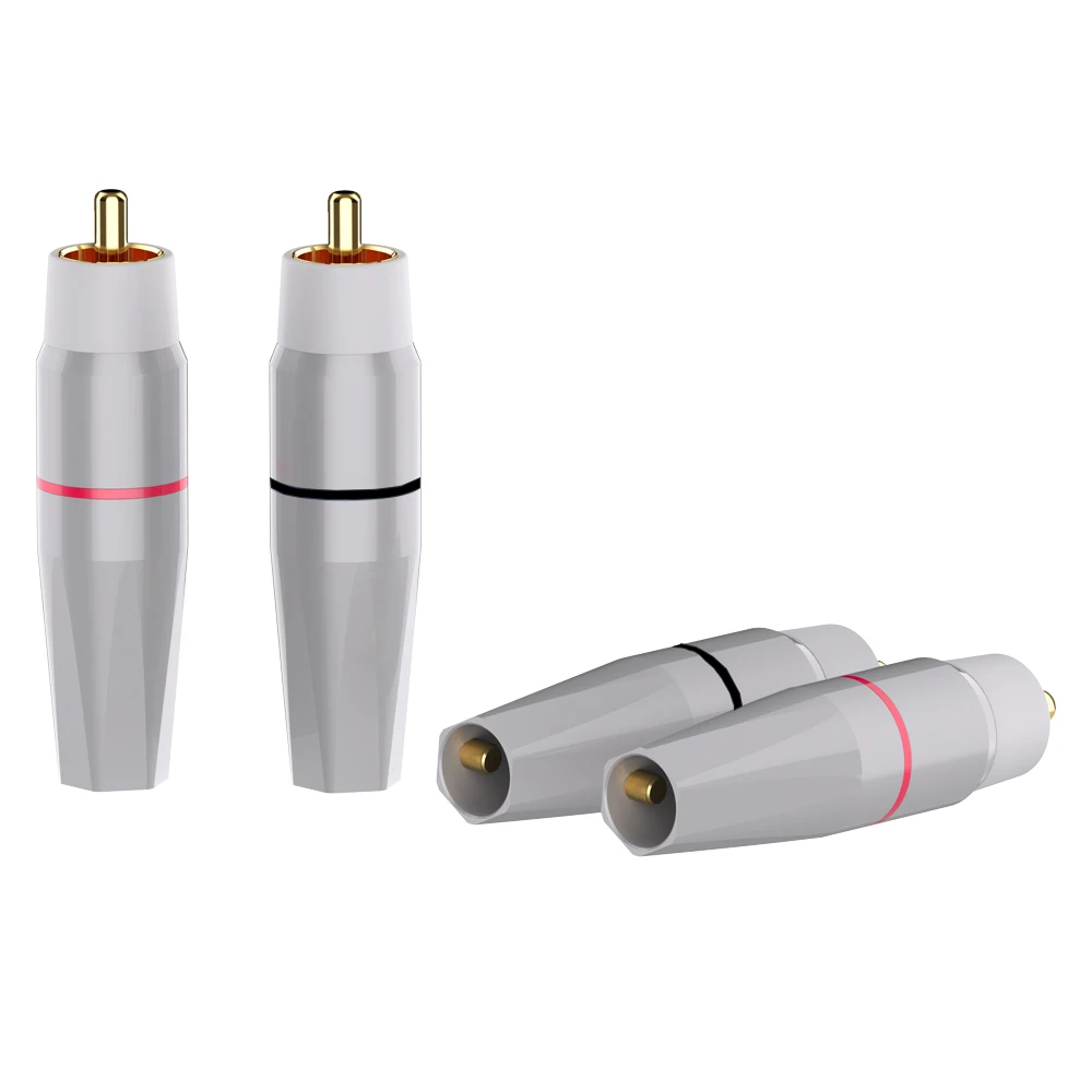 Enhance your high-end audio setup with this set of four RCA plugs, crafted for superior sound. Featuring a sleek, modern design, each connector boasts a polished metallic silver body with a white plastic top surrounding a shiny gold or rhodium pin. The color-coded red and black connectors help you easily identify channels, ensuring connection accuracy. Made from 99.998% pure copper with multi-layer plating, these connectors guarantee excellent conductivity, durability, and corrosion resistance. Their robust brass shells with an outer diameter of 8.8mm and soldering connections provide a secure fit. Whether upgrading your amplifier, CD player, or TV, this set adds a touch of elegance and reliability to your audio system for optimal listening experiences.