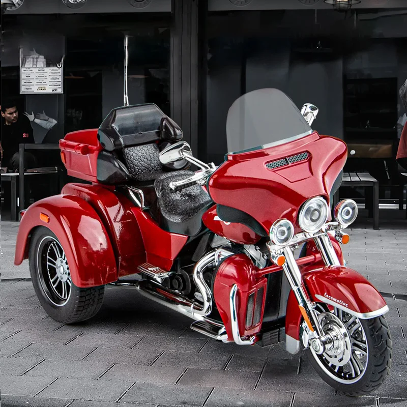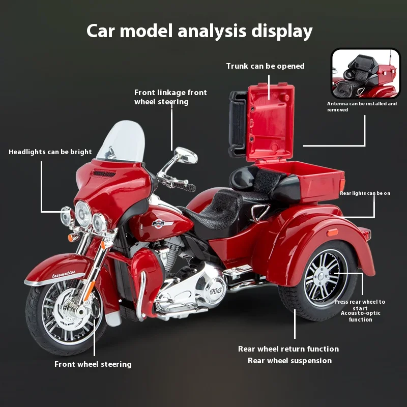 Imagine adding a touch of classic adventure to your space with this premium motorcycle alloy model. This vibrant red motorcycle, complete with an eye-catching sidecar, captures the essence of touring style and craftsmanship. The glossy finish shines in any light, while the intricate details—like dual headlights, textured seat resembling leather upholstery, and realistic exhaust pipes—bring the model to life. Whether displayed on your car center console or gracing your desktop, this model provides a unique conversation piece and a celebration of motorcycling culture that enhances your ambiance.