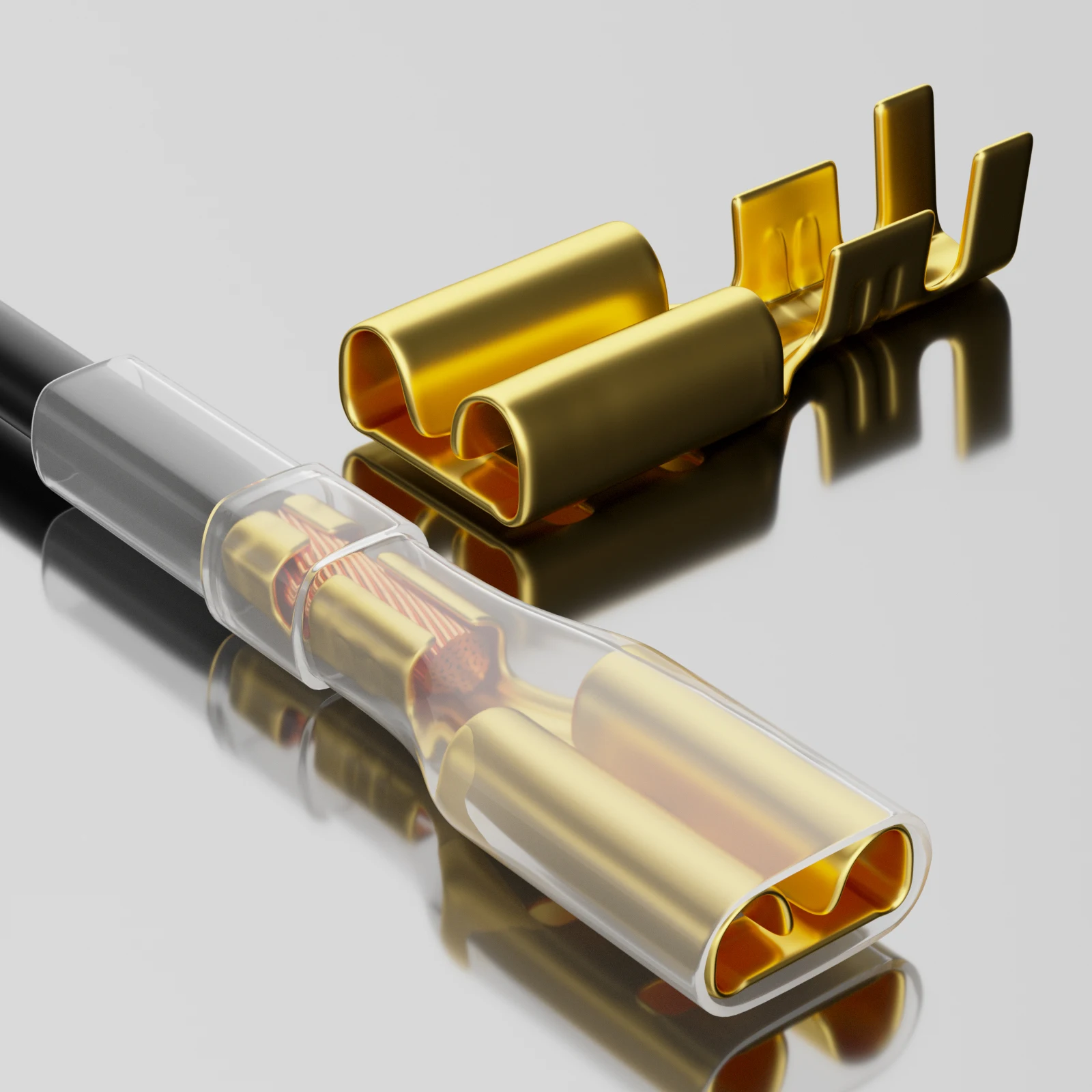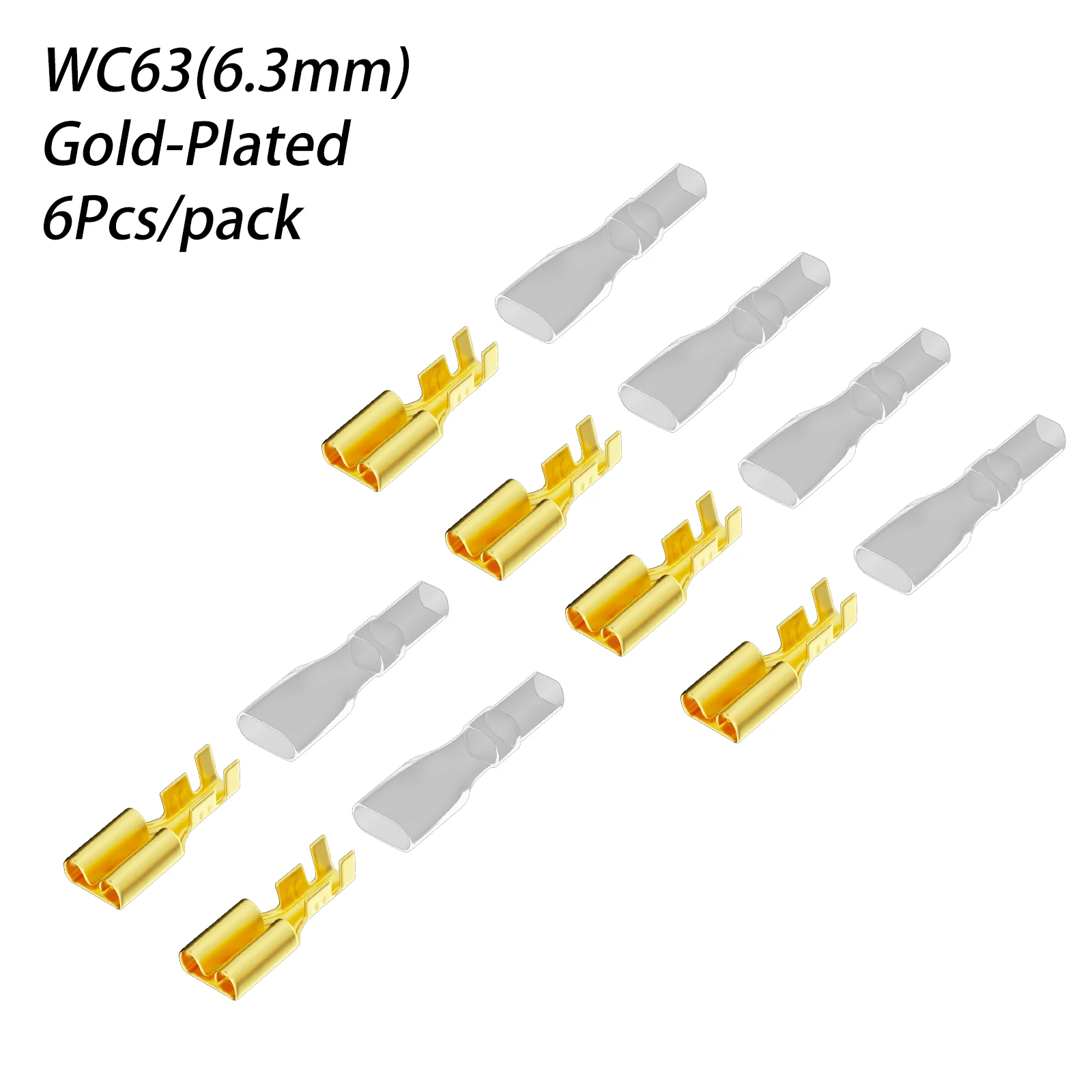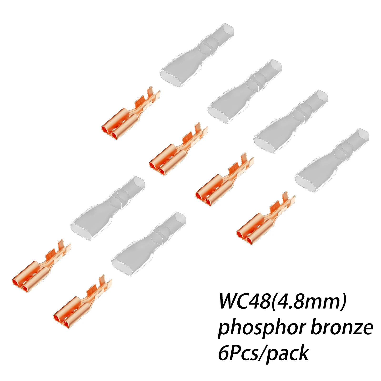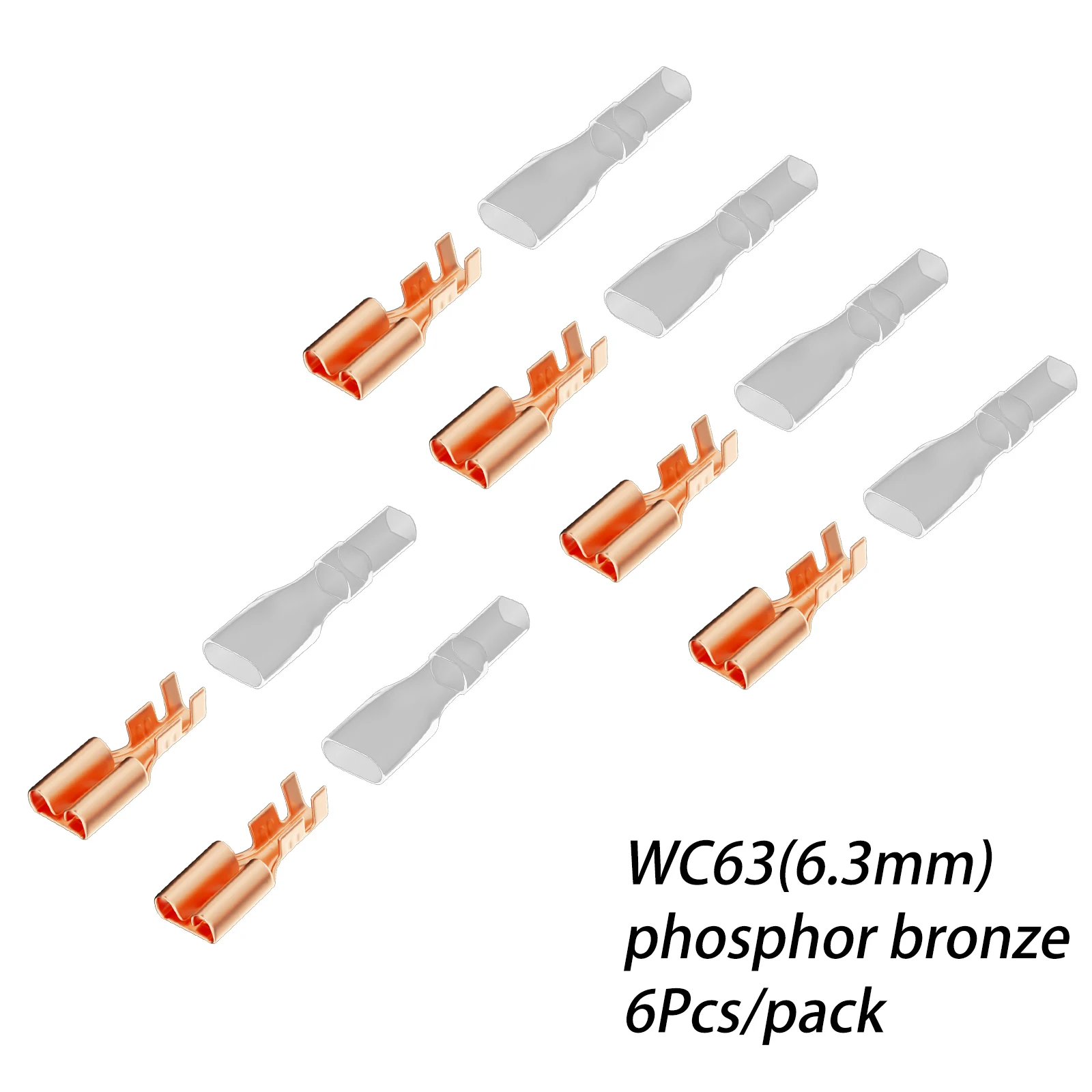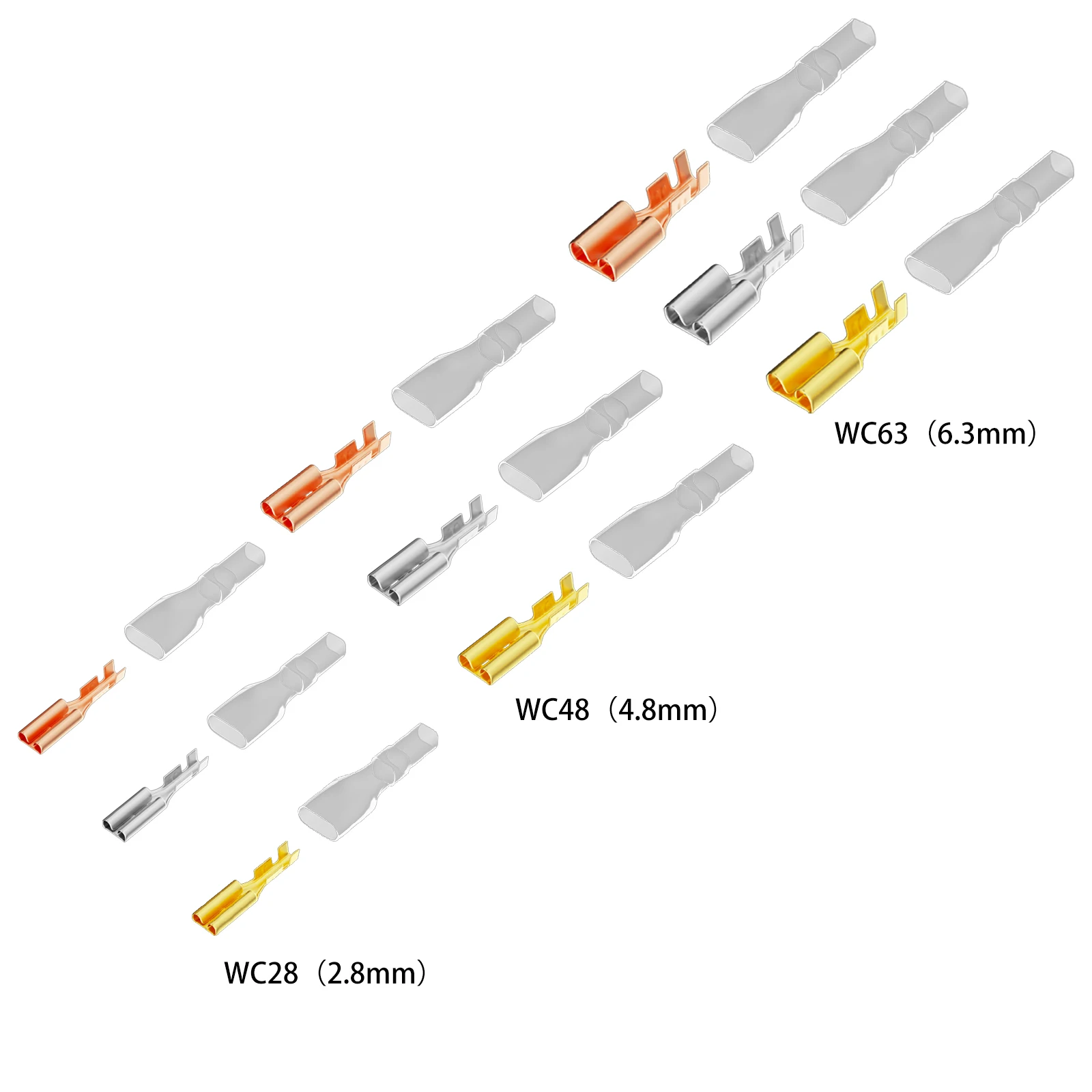 Enhance your electrical projects with this premium set of spade connectors, designed to ensure reliable and secure connections. Crafted from high-quality phosphor bronze, these connectors feature a sleek, polished finish in silver, copper, or gold tones, offering both durability and aesthetic appeal. The transparent insulation covers provide added safety and insulation, seamlessly fitting over the metal parts for a clean look. Available in three models—WC28, WC48, and WC63—each with different sizes and wire gauges, you can confidently select the perfect fit for your specific needs. Whether for audio equipment, electrical installations, or custom wiring, these connectors combine precision craftsmanship with advanced electroplating technology, ensuring excellent conductivity and corrosion resistance over time. Experience seamless performance and durability with this excellent connector set.