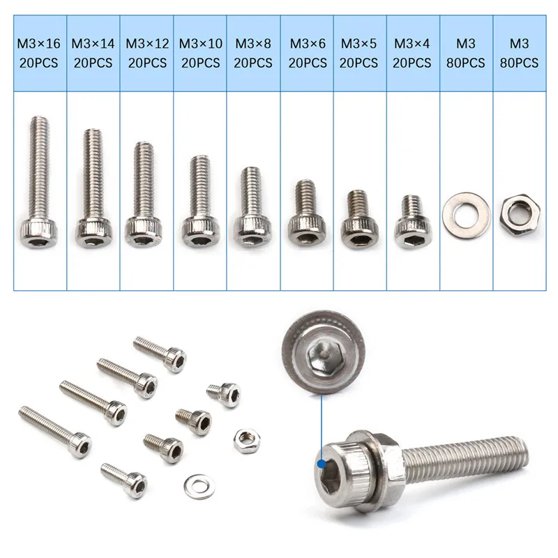 - Technical specs: M3 diameter, lengths 4mm, 5mm, 6mm, 8mm, 10mm, 12mm, 14mm, 16mm; stainless steel material; hex drive style; corrosion-resistant.