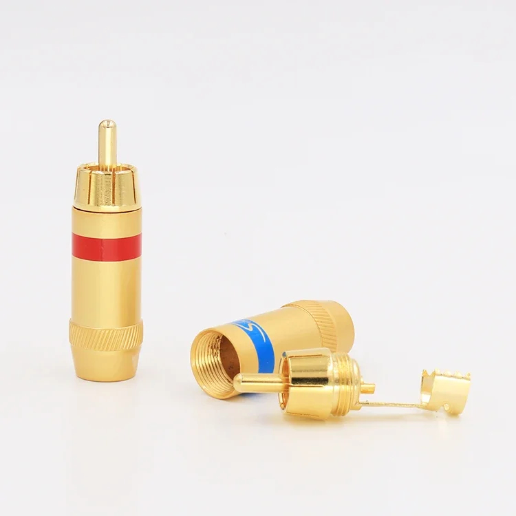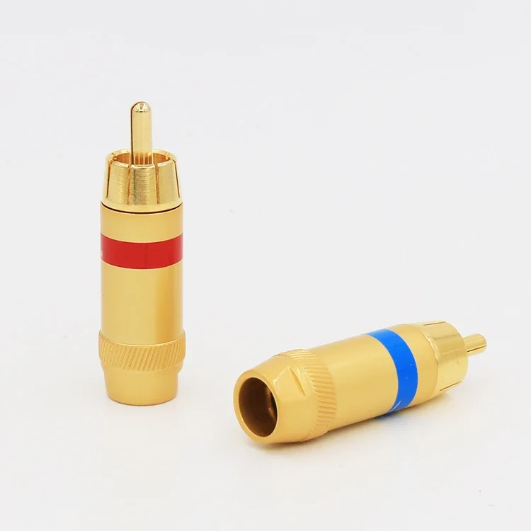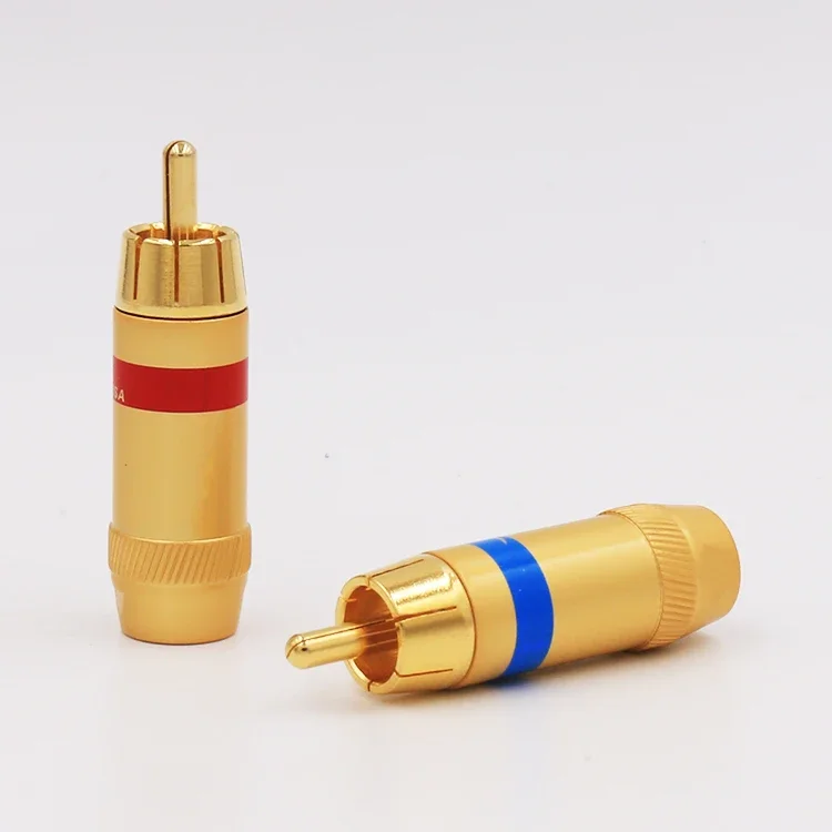 Experience the ultimate connectivity with this set of this VR009G male RCA plugs, crafted for audiophiles and DIY enthusiasts. These connectors boast a sleek, cylindrical design with a polished 24K gold-plated brass finish that ensures excellent signal transmission and long-lasting durability. Featuring a compact length of approximately 45mm and an 8mm diameter hole at the end, they are perfect for soldering and custom wiring projects. The textured knurled grip near the base provides an easy and secure handling experience. With vibrant red and blue color-coded bands, these connectors help you organize your audio and video channels effortlessly. Their high-quality, professional appearance makes them a perfect upgrade for your hi-fi cables and DIY audio setups.