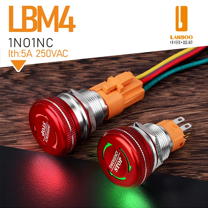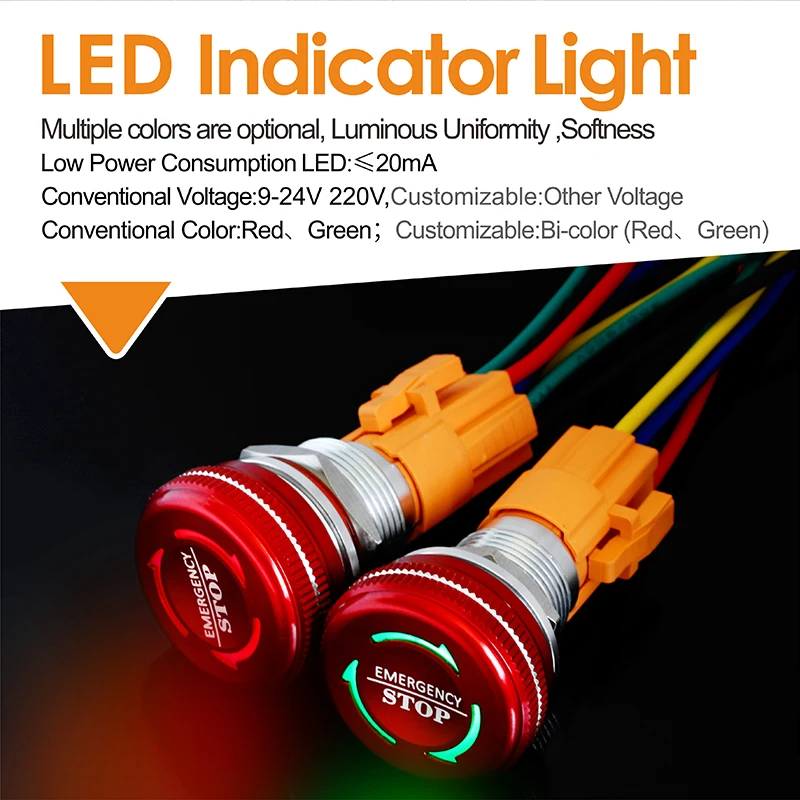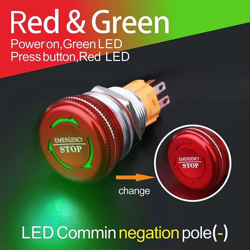 Imagine having the ultimate control in critical moments with this emergency stop push button switch. Designed for industrial safety, it features a striking red, circular button with serrated edges for quick activation. The prominent “STOP” label and encircling arrow enhance visibility and intuitive use. Its textured, metallic chrome-like outer shell exudes durability, reinforced by a knurled ring for firm grip. Available in 16mm, 19mm, and 22mm sizes, the switch boasts waterproof IP65 protection, ensuring reliable performance in challenging environments. Equipped with high-quality silver contacts and dual-color LED indicators, this switch supports voltage options of 3-8V, 9-24V, or 220V. Its self-locking, anti-slip M4 design offers comfortable, secure operation, making it the dependable choice for safety-critical applications.
