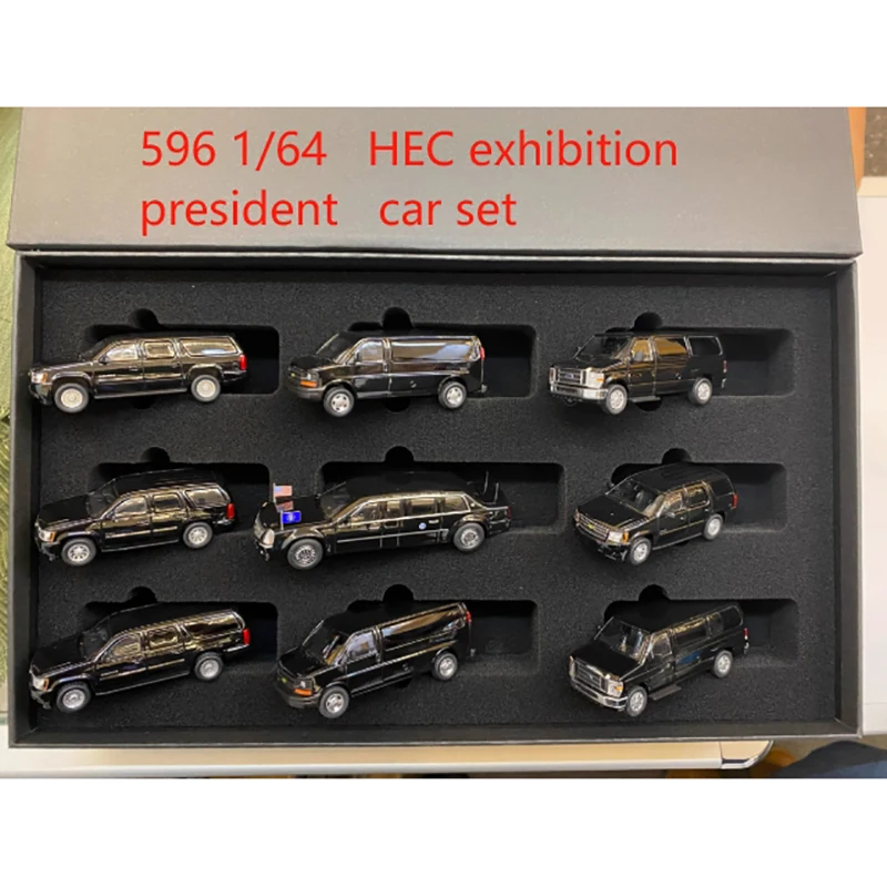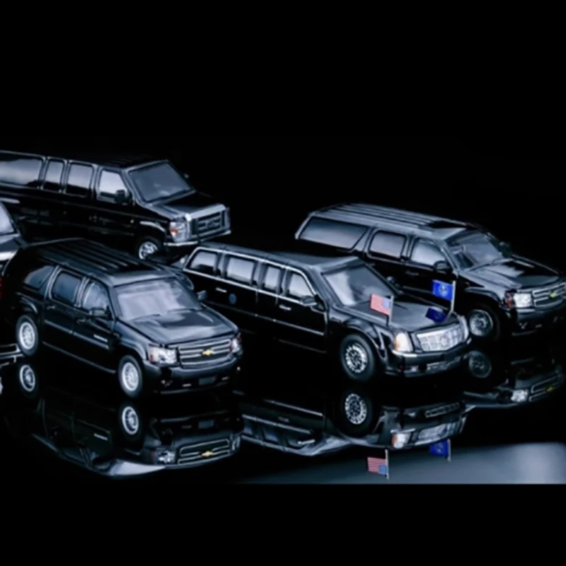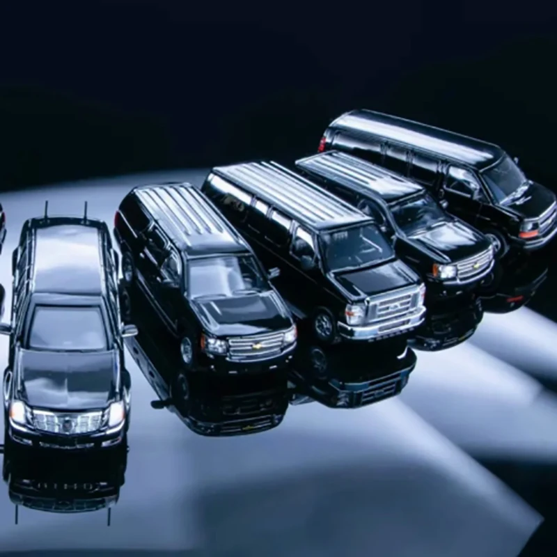 Immerse yourself in the world of precision and sophistication with this 1/64 scale diecast car model set, featuring the iconic Presidential Security Convoy. This meticulously crafted collection includes nine vehicles showcasing a polished black finish that captures the essence of luxury and security. The standout “Beast” limousine, designed for protection, complements the sleek Suburban Tahoe models, all reflecting intricate details such as windows, wheels, and metallic accents. Each vehicle is made from high-quality metal, ensuring durability and an impressive aesthetic for display. With no need for batteries, this model set is perfect for adult collectors who appreciate the finer things in life and perfect for displaying or appreciating its detailed craftsmanship.