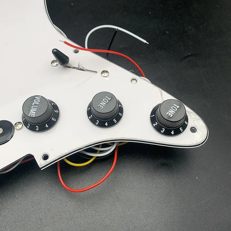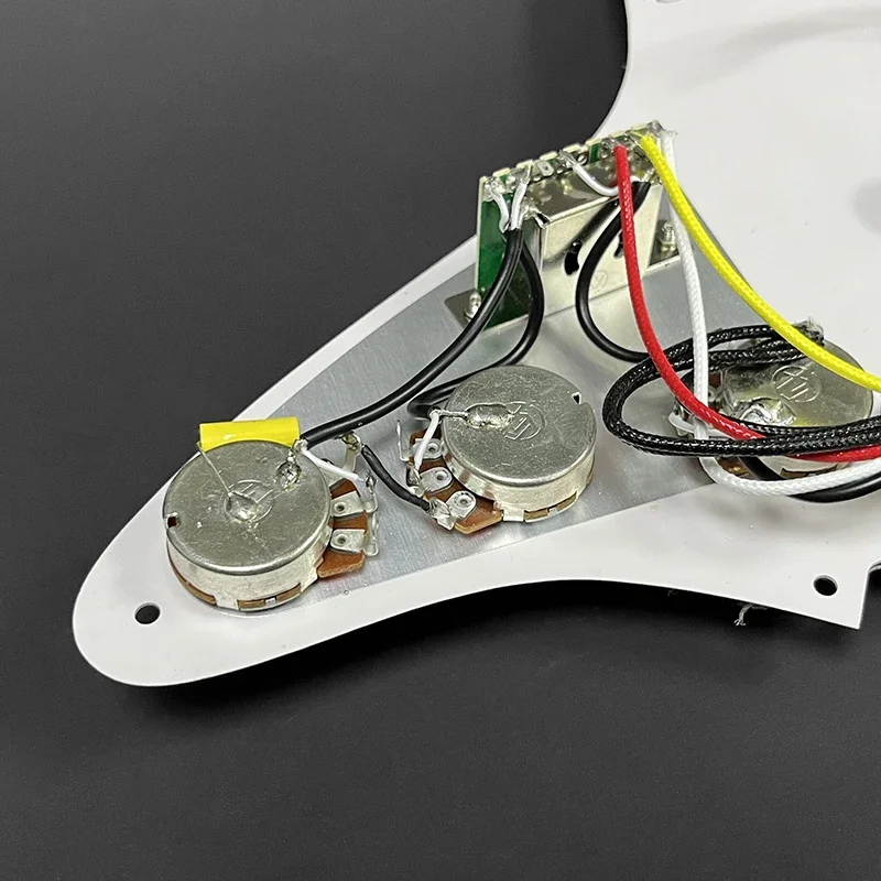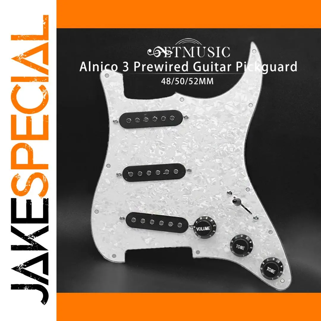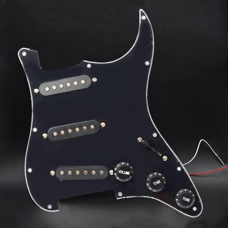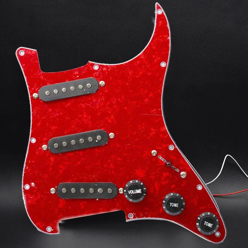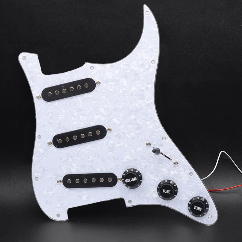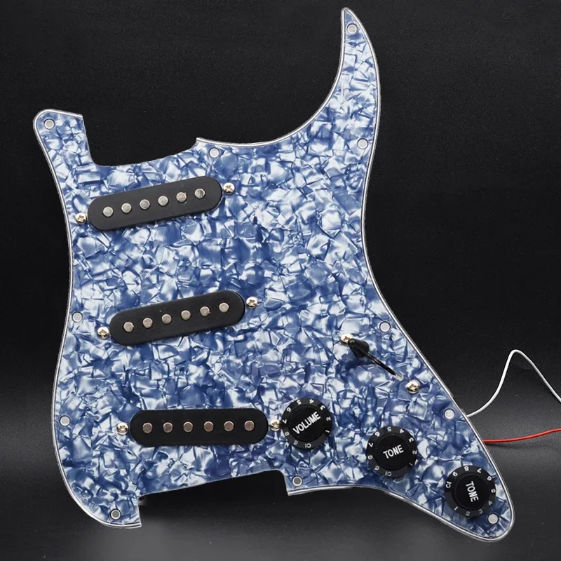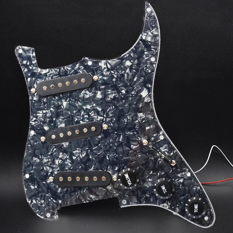 Elevate your guitar’s aesthetics and tone with this prewired SSS pickguard featuring three vintage staggered Alnico 3 pickups with plastic bobbins and noise-reduction fiber conductors, rated at 5-6KΩ for neck/middle and 6-7KΩ for bridge pickups. Compatible with Fender-style Stratocasters and available in pole spacings of 48mm, 50mm, or 52mm, the 3-ply PVC pickguard includes 11 screw holes and accommodates three single-coil pickups. It comes fully assembled with two A250k tone pots, B250k volume pot, 5-way switch, 223J 400V capacitor, and a full set of mounting screws, offered in nine striking colors including Pearl, Shell, and Pearl-effect finishes.