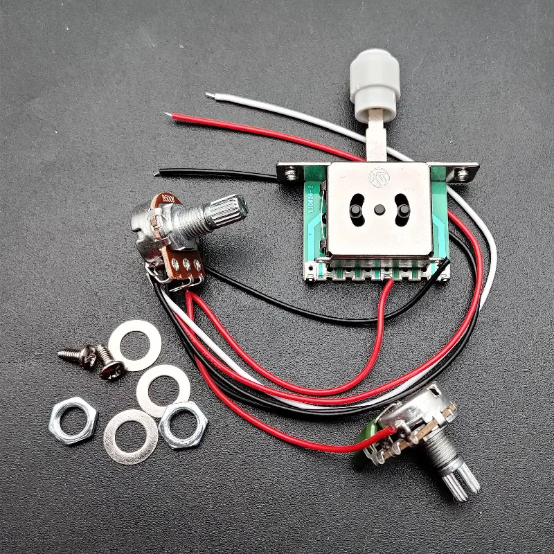 Elevate your guitar playing experience with this prewired wiring harness designed exclusively for TL electric guitars. Featuring a streamlined assembly, it includes two high-quality 15mm 500K potentiometers with knurled metal knobs for easy adjustment of volume and tone. The shine of the metallic three-way switch adds a professional touch while maintaining functionality. With vibrant red wiring that connects the components with clarity, you will find installation a breeze as you solder your pickups. Choose from stylish color options—Black, White, or Cream—to customize your setup to suit your aesthetic. This harness is perfect for both seasoned guitarists and enthusiasts looking to enhance their instrument.