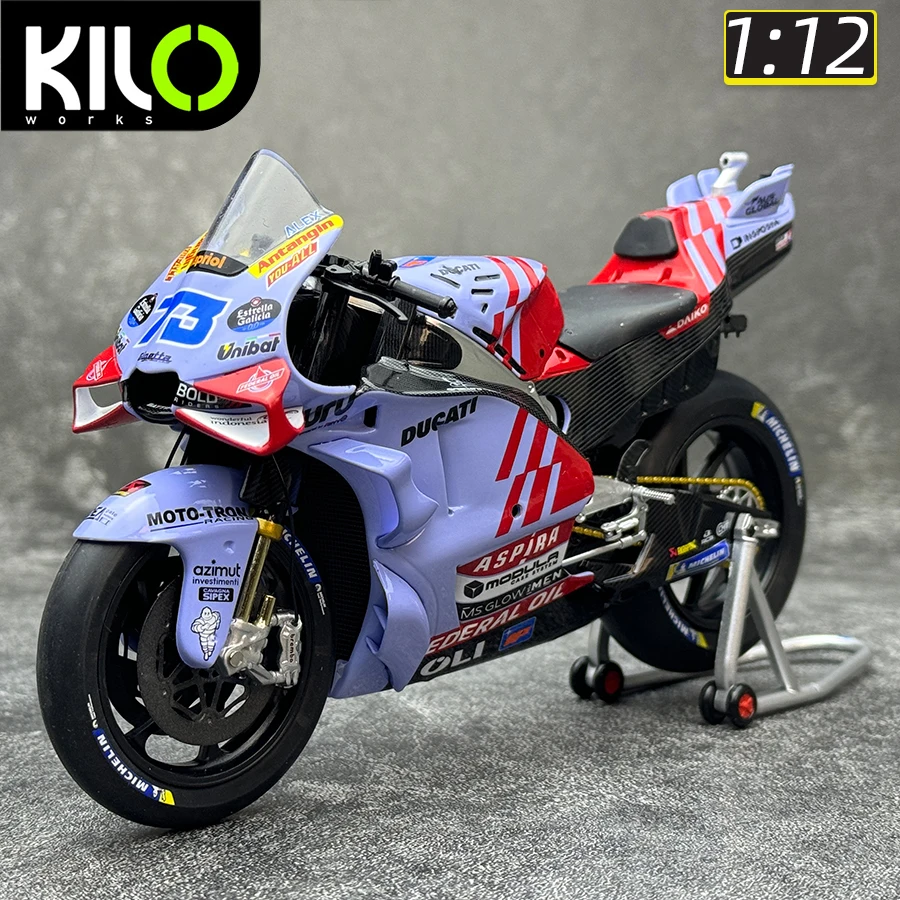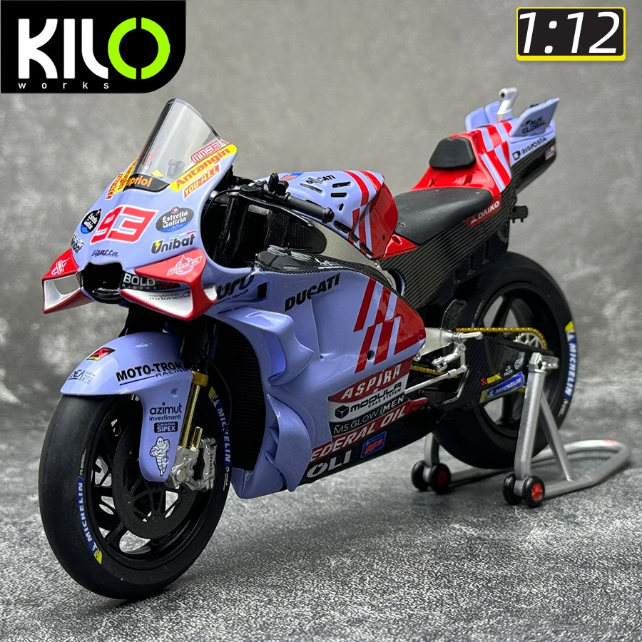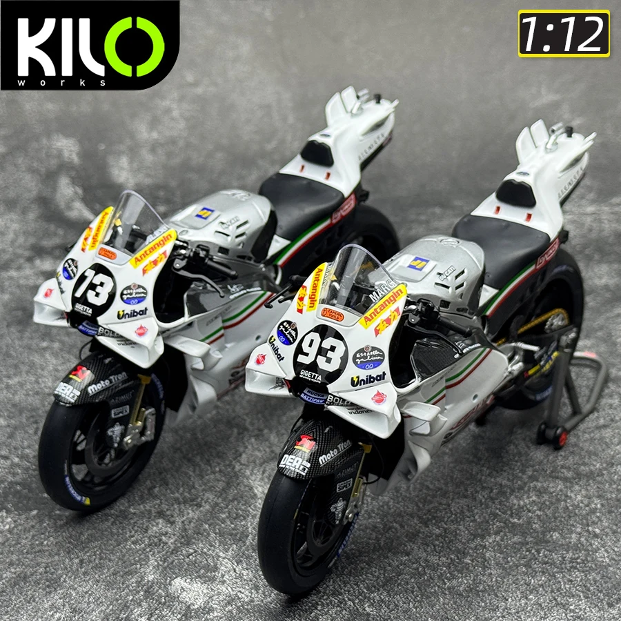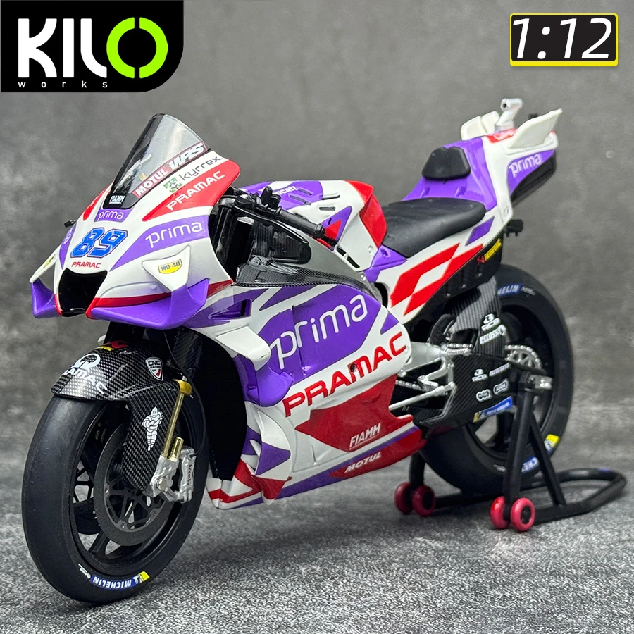 Experience the thrill of racing with this meticulously crafted 1:12 scale die-cast motorcycle model, representing the GP23 and GP24 models from Prima Pramac Racing. Made from high-quality metal, these models feature vibrant decal designs including sponsor logos like “Annamaria,” “Unibat,” and “BOLD,” along with bold racing numbers in black on white backgrounds. The aerodynamic fairings feature Italian flag stripes, transparent windshields, and detailed wheels with Michelin tires, realistic brake discs, and calipers. Gold-colored fork suspensions and intricate rear mechanical components such as chain drives and sprockets add to its authenticity. The sleek, smooth contours and colorful accents make this model a perfect collector's piece for racing fans and enthusiasts alike. Embellish your collection with this eye-catching display piece or gift someone who appreciates racing craftsmanship.