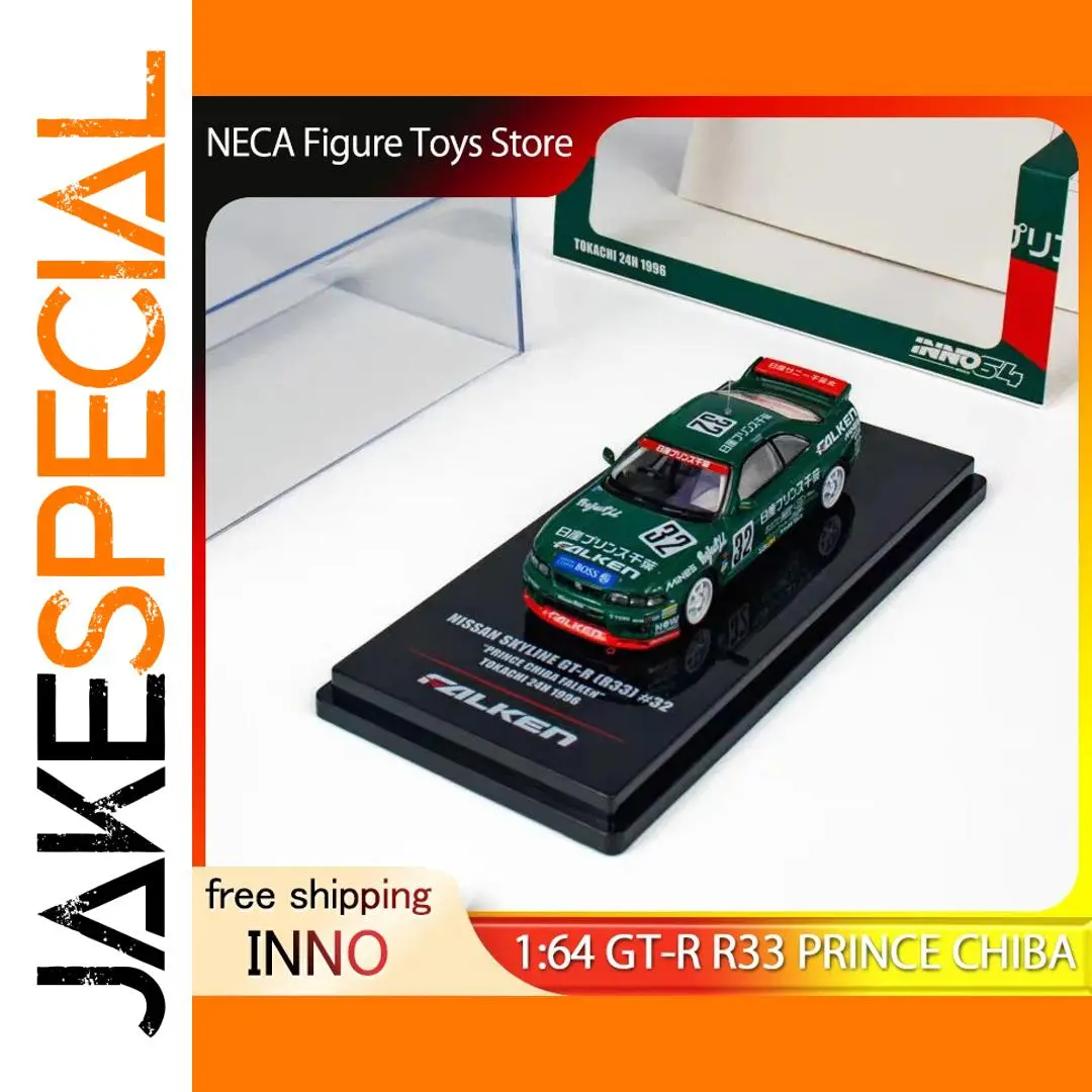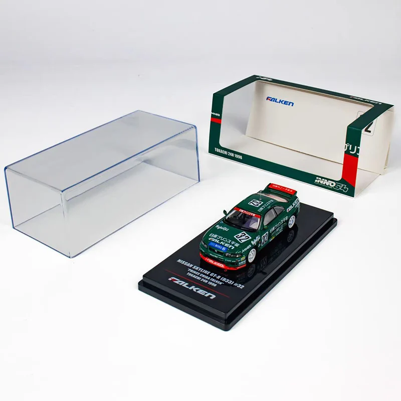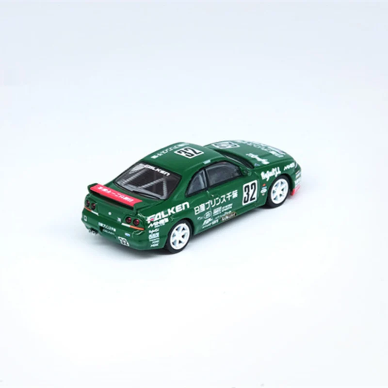 Immerse yourself in the world of racing with this highly detailed 1:64 scale diecast model of the Nissan Skyline GT-R R33 in vibrant Prince Chiba Green. Crafted from alloy with a glossy finish, it features authentic racing decals, a low-profile aerodynamic body, black side mirrors, white realistic wheels, and a striking red racing wing with white lettering. Perfect for collectors and enthusiasts aged 14 and up, this non-radio controlled model showcases meticulous design elements that capture the sleek, sporty silhouette of the original vehicle. An ideal addition to any car collection or a standout gift for racing fans, it brings the thrill of the race track to your display.