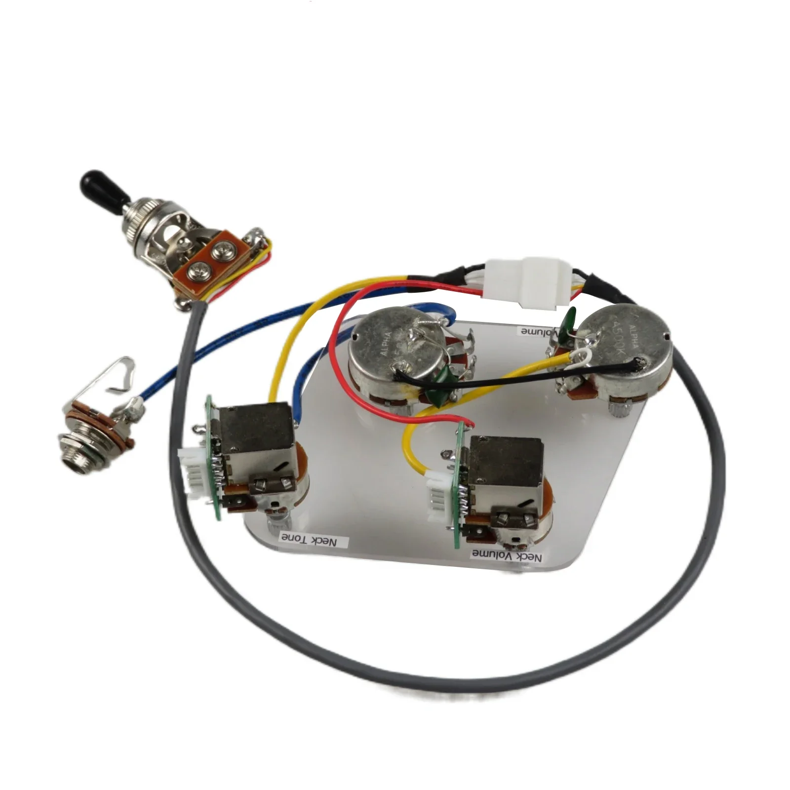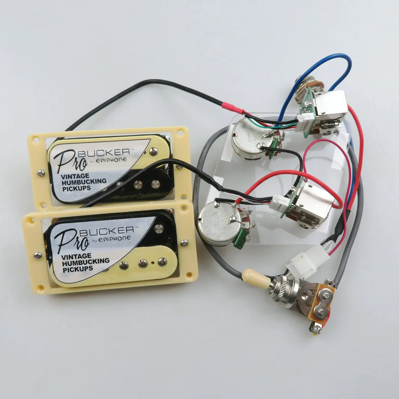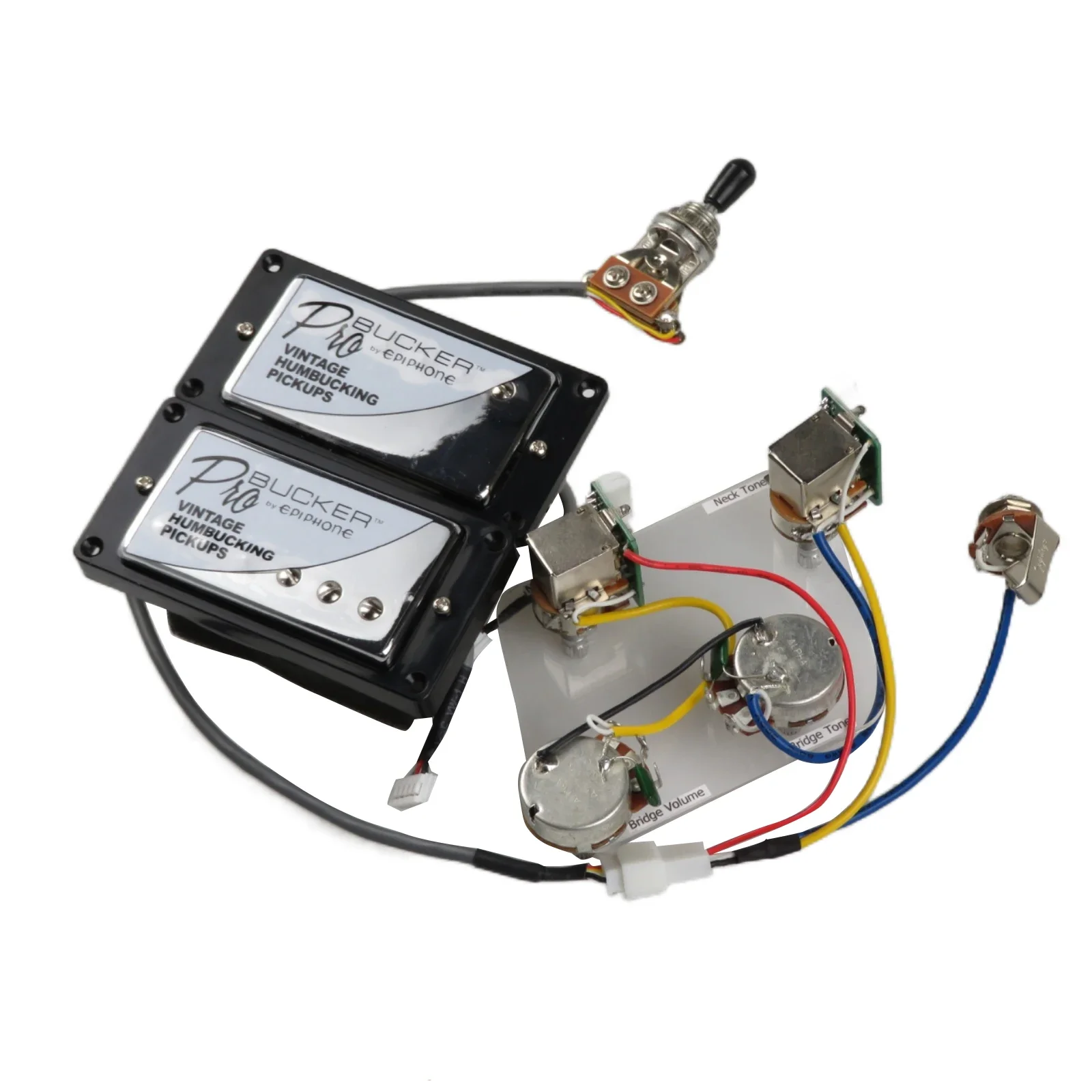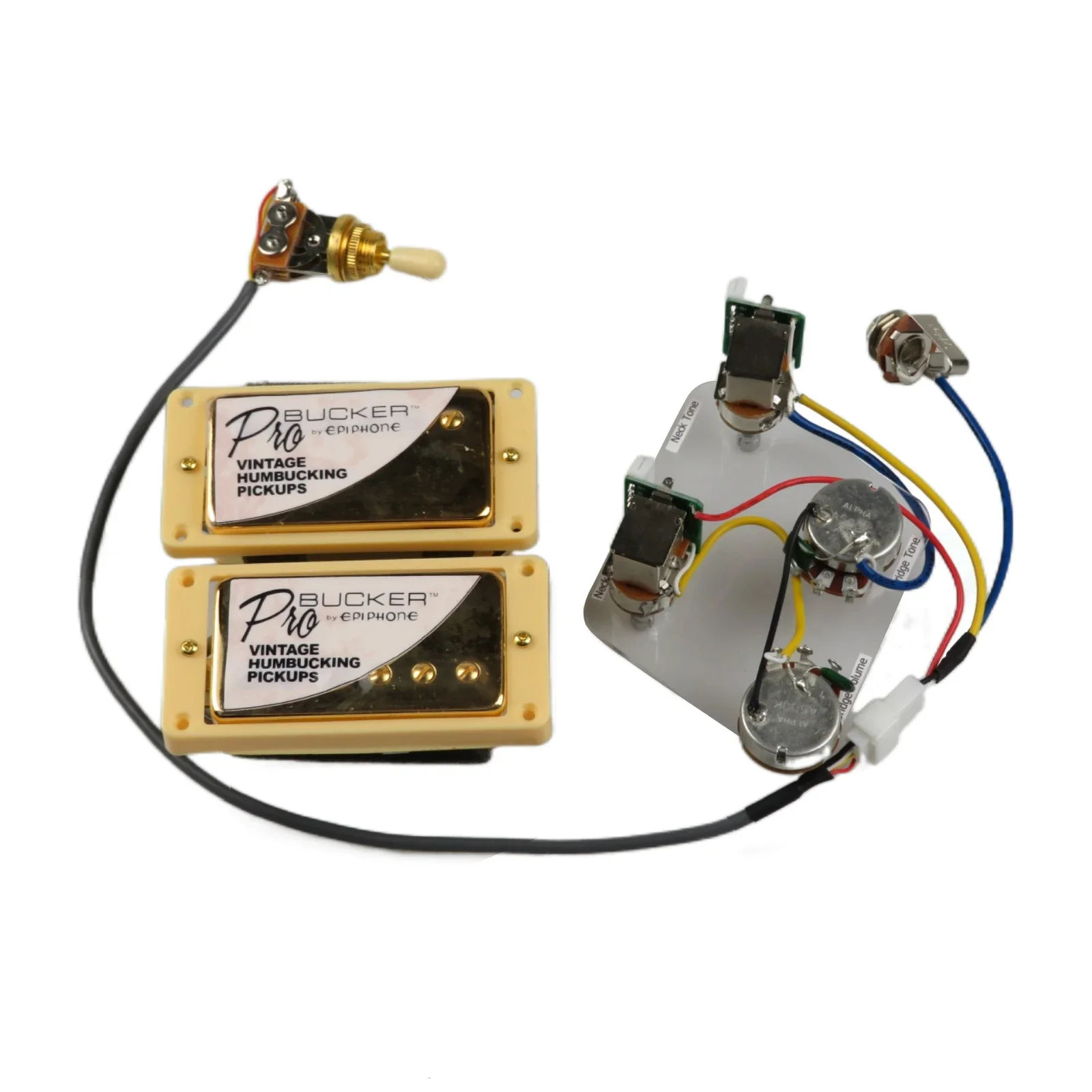 Enhance your guitar’s tone with this premium ProBucker Humbucker Pickup Set, featuring two humbuckers with resistance ratings of 7.5KΩ (neck) and 8.6KΩ (bridge), designed for seamless installation and versatile sound shaping. The pickups are triple wax-dipped and vacuum sealed to minimize noise and feedback, with adjustable height screws and springs for optimal setup. The wiring harness includes push/pull volume controls with coil tapping via two B500K and two A500K potentiometers, all connected through a user-friendly 5P plug-in terminal interface for solder-free installation. Available in sleek black, vibrant red, luminous yellow, elegant gold, classic chrome, and rich bronze, offering a sophisticated aesthetic alongside reliable performance for seasoned players.