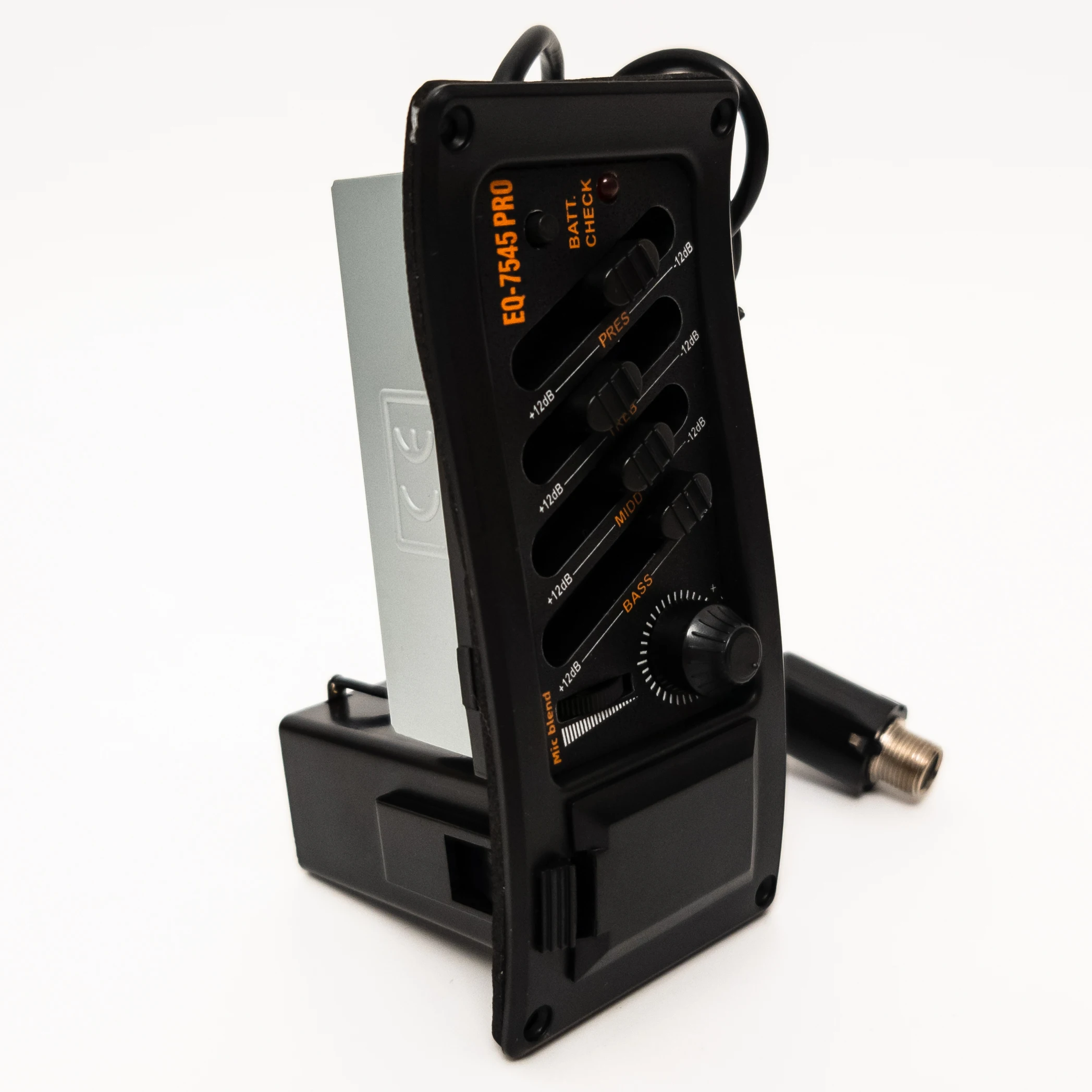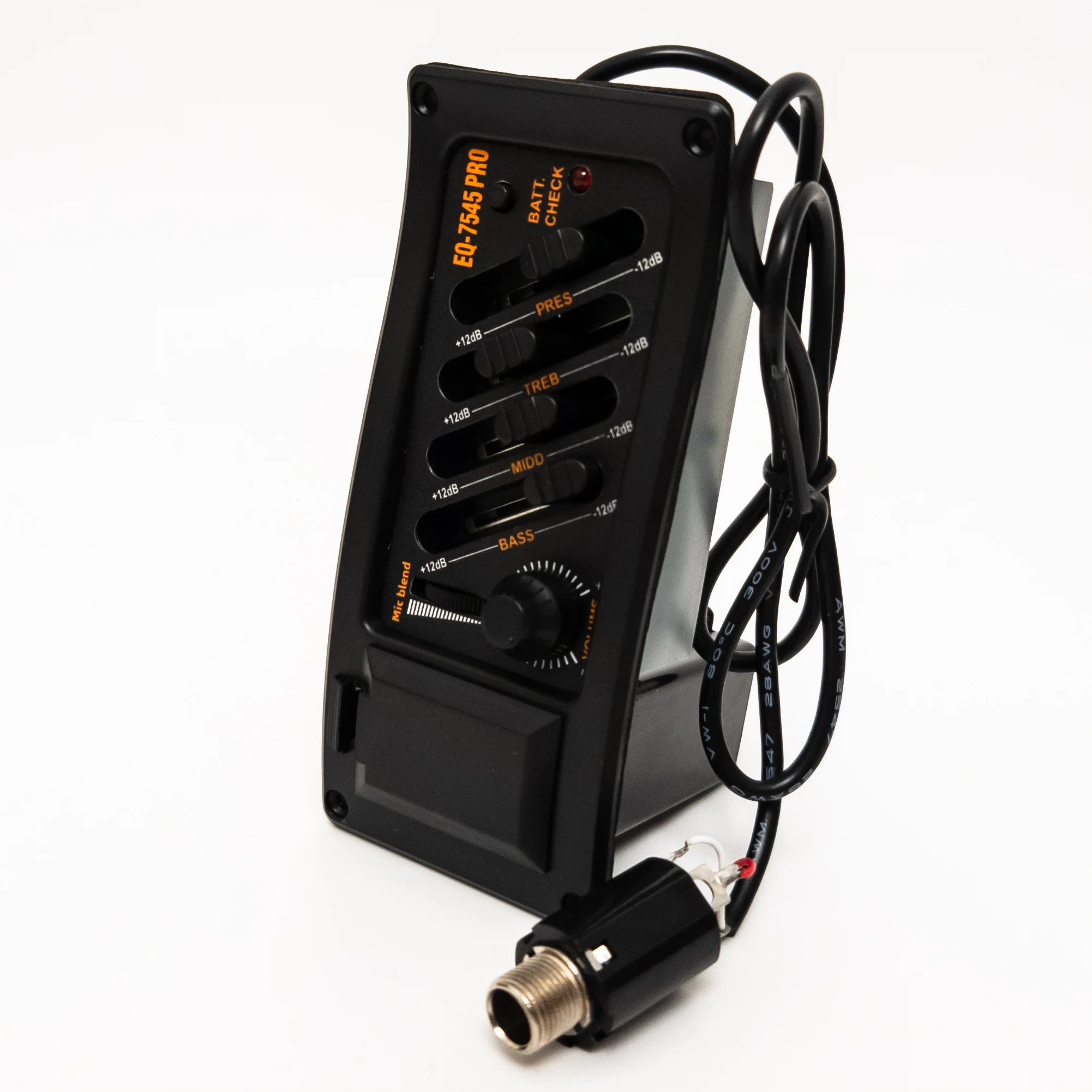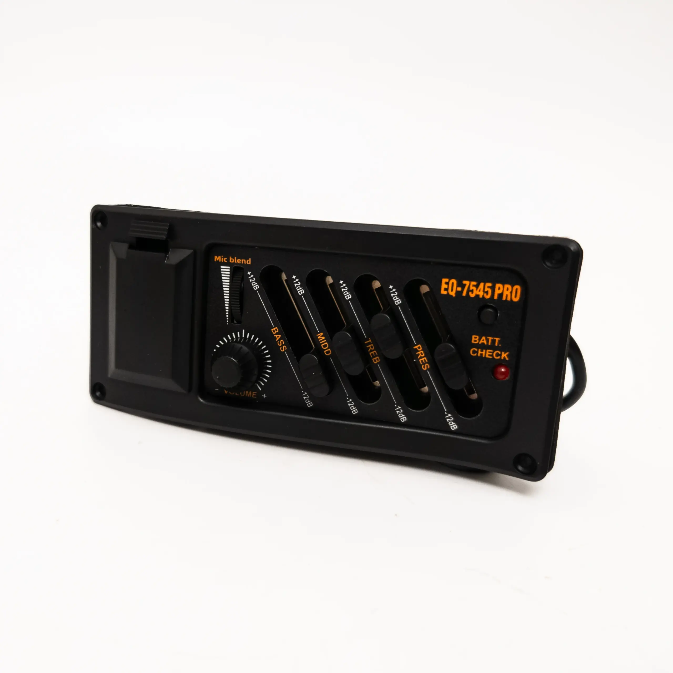 Transform your guitar sound with this high-quality 4-band guitar pickup equalizer preamp. Designed with a durable black ABS panel, it offers a modern, minimalist look that seamlessly blends with your instrument setup. The device measures approximately 10.3 × 4.5 cm, making it compact yet highly functional. With clearly labeled sliders for bass, middle, treble, and presence, adjusting your tone becomes intuitive and precise. The large rotary knob allows for easy bass boost control, helping you craft your perfect sound. Equipped with a built-in battery check indicator, you'll always stay informed about your power status. This preamp comes with essential accessories, including a shielded pickup cable, output jack assembly, and mounting hardware, ensuring simple installation and reliable performance. Enhance your musical expression with this professional-grade system.