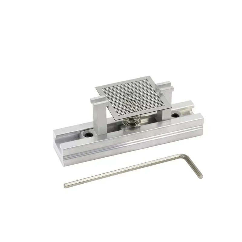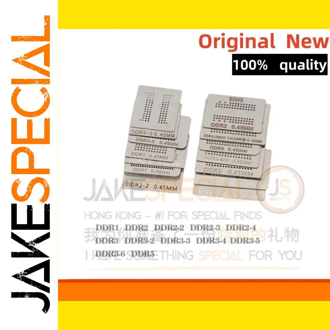 This precision BGA stencil reballing and rework station kit features 12 meticulously crafted rectangular stencil plates with a 0.45mm thickness, designed for DDR1, DDR2, DDR3, DDR5, DDR2-3, DDR3-2, and GDDR5 memory modules. Made from durable, light-colored materials, each plate has precisely drilled holes arranged to match specific memory configurations, enabling accurate reballing and soldering. The kit includes a sturdy bracket and is equipped with direct heat functionality, ensuring efficient and reliable performance for professional technicians. Ideal for high-precision memory module repairs, this comprehensive kit combines functionality with a clean, industrial aesthetic for trusted rework success.