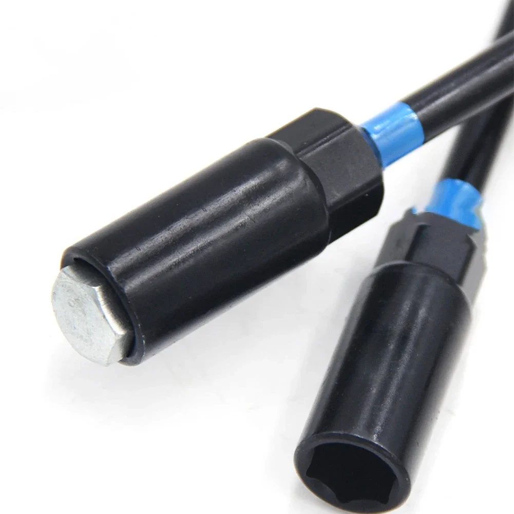 - Features textured black handles for a secure grip, minimizing slipping during use, and includes a blue ring near the socket end as a visual marker or protective element.