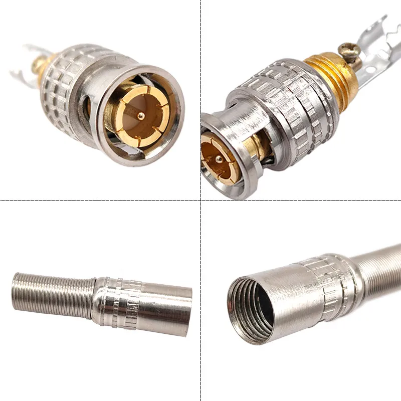 Enhance your security and surveillance setups with this set of 5 high-quality BNC connectors featuring a sleek silver finish and gold-plated copper contacts for optimal signal transmission. Designed with precision, these galvanized alloy shell connectors are available with solderless or welding connection options, supporting 75-5 ohm and 75-3 ohm configurations. Their cylindrical shape, detailed threading, and polished look offer a professional aesthetic while ensuring durability and reliable long-distance video signal connection. Suitable for monitoring cameras operating at voltages of 5V, 12V, 20V, and 30V, these connectors are ideal for professional security systems requiring high-frequency, high-quality connections.