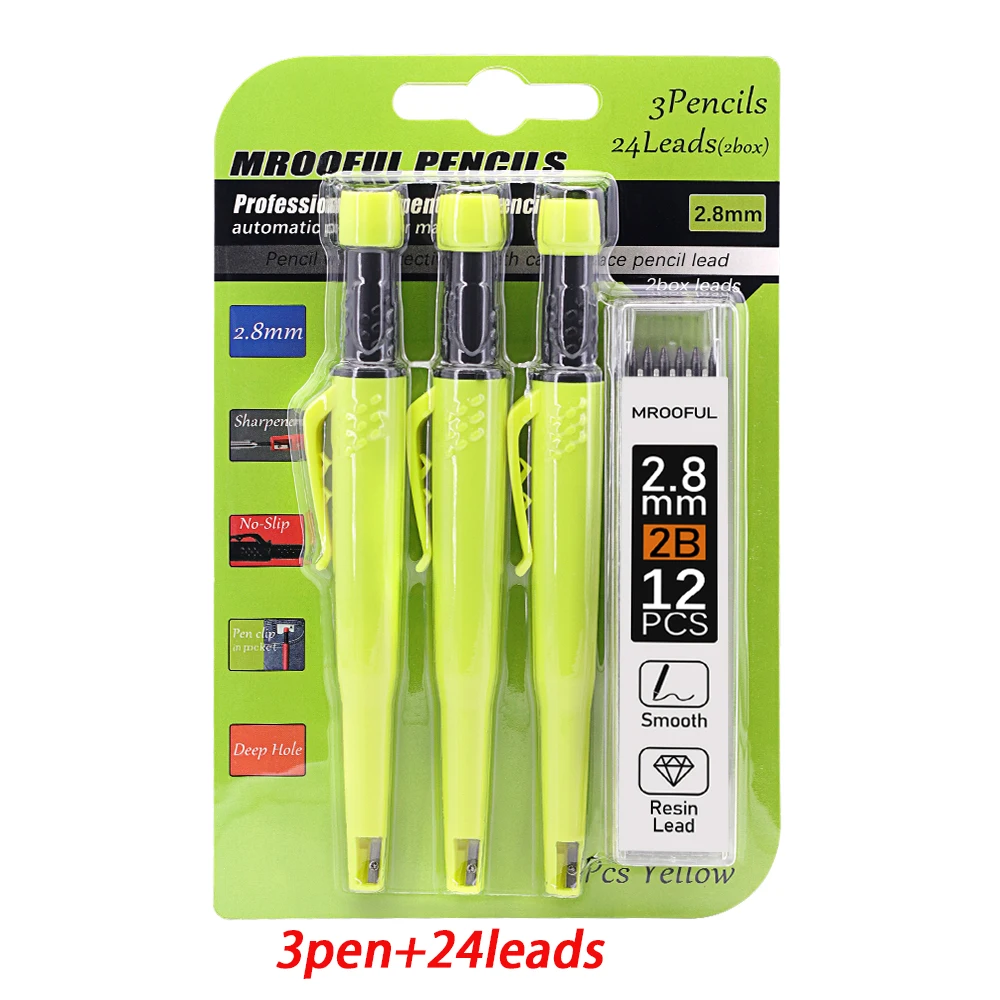 Experience precision and practicality with this professional carpenter's pencil set from JOMPENS, designed for detailed marking and drawing in various engineering and woodworking projects. The set includes vibrant, durable yellow-green pencils with ergonomic black textured grips, ensuring comfort during extended use. The built-in yellow clip allows you to keep the pencils handy by attaching them to bags or clothing, ideal for busy work environments. The set features a screw-in sharpener at the top of each pencil, ensuring the perfect point is always at your fingertips. Including two boxes of high-quality 2.8mm leads marked 2B, you can confidently mark on metal, plastic, glass, wood, or paper surfaces. This set combines functionality with bold style, making it a reliable choice for professionals.