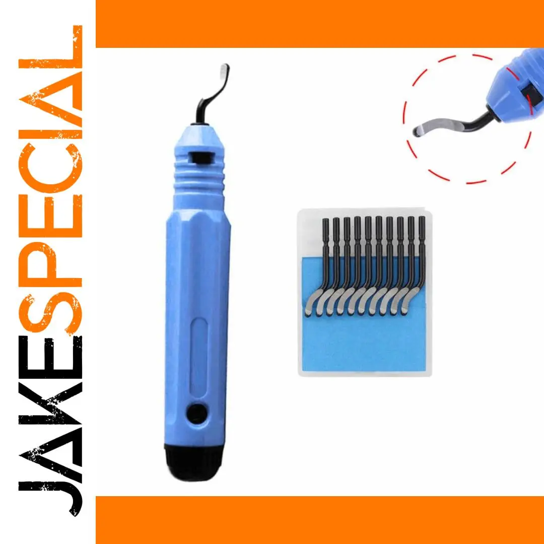 - Ten interchangeable high-speed steel blades (6542 steel) with a sleek, curved design for precise deburring of edges and holes.