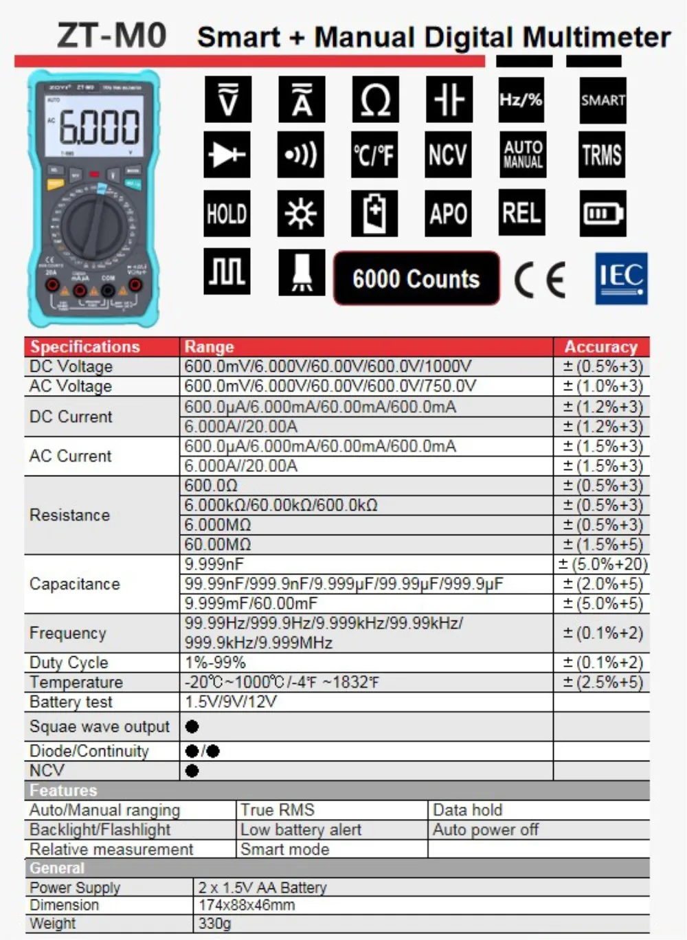 - 6000 counts LCD display with bright backlight for clear readings in all lighting conditions, ensuring accuracy and visibility during use in various environments.