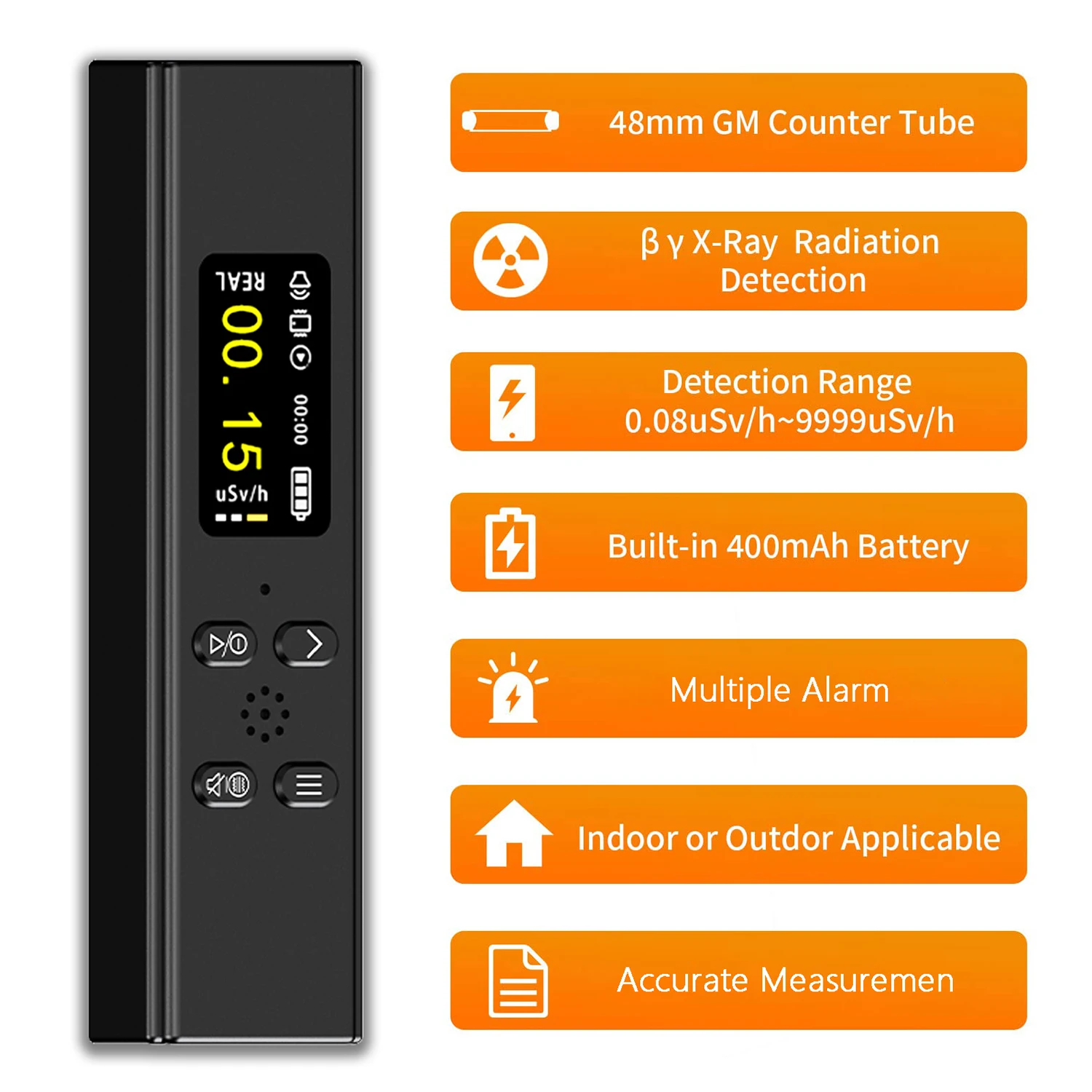 - Utilizes a professional Geiger counter and GM tube for precise detection of beta, gamma, and X-ray radiation across a wide range.