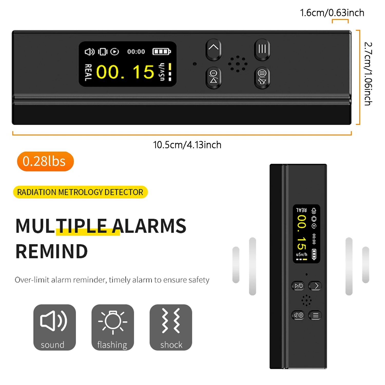 - Equipped with customizable alarms for dose rate and cumulative exposure, alerting you with loud sounds and flashing visuals when limits are exceeded.