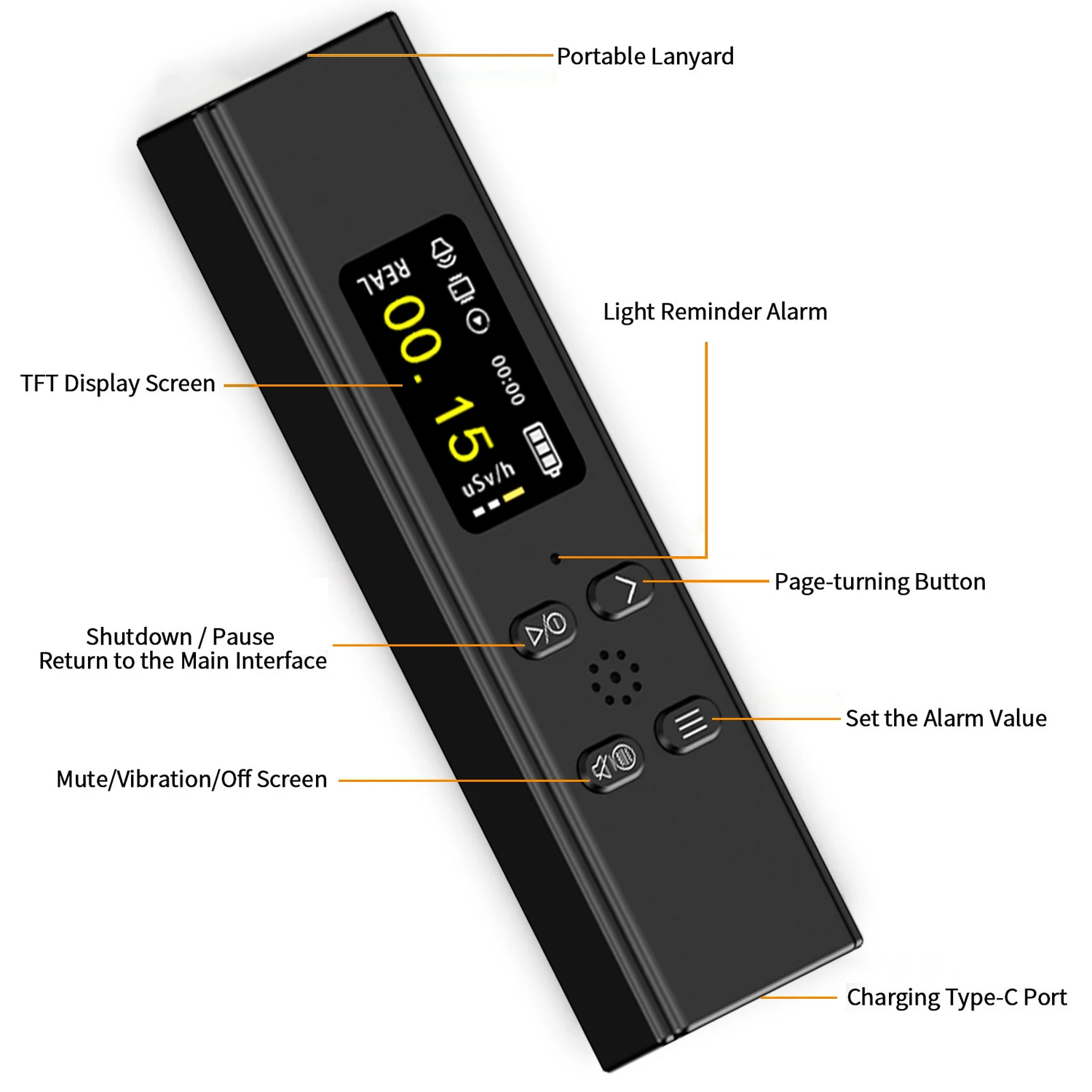 - Displays real-time data with a 0.96-inch color TFT screen, updating radiation dose every second for immediate awareness.