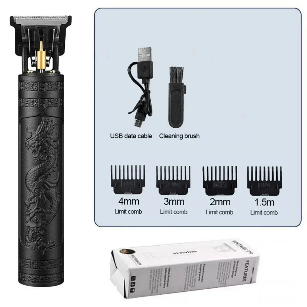This professional hair trimmer set features three distinct models: a gold clipper with an ornate dragon design, a matte black clipper with embossed patterns, and a brushed silver clipper also showcasing dragon engravings. Each clipper is equipped with stainless steel blades, operates with a vibratory motor, and includes a black blade guard for precision cutting. With a battery charging time of up to 2 hours and a battery life exceeding 90 minutes, the trimmer supports both mains and battery operation. It comes with 3 to 4 interchangeable nozzles for adjustable lengths, suitable for wet and dry haircuts, and various grooming purposes. Available colors: Golden 2, Bronze 2, Bronze 1, Black 2, Black 1, Golden 1.