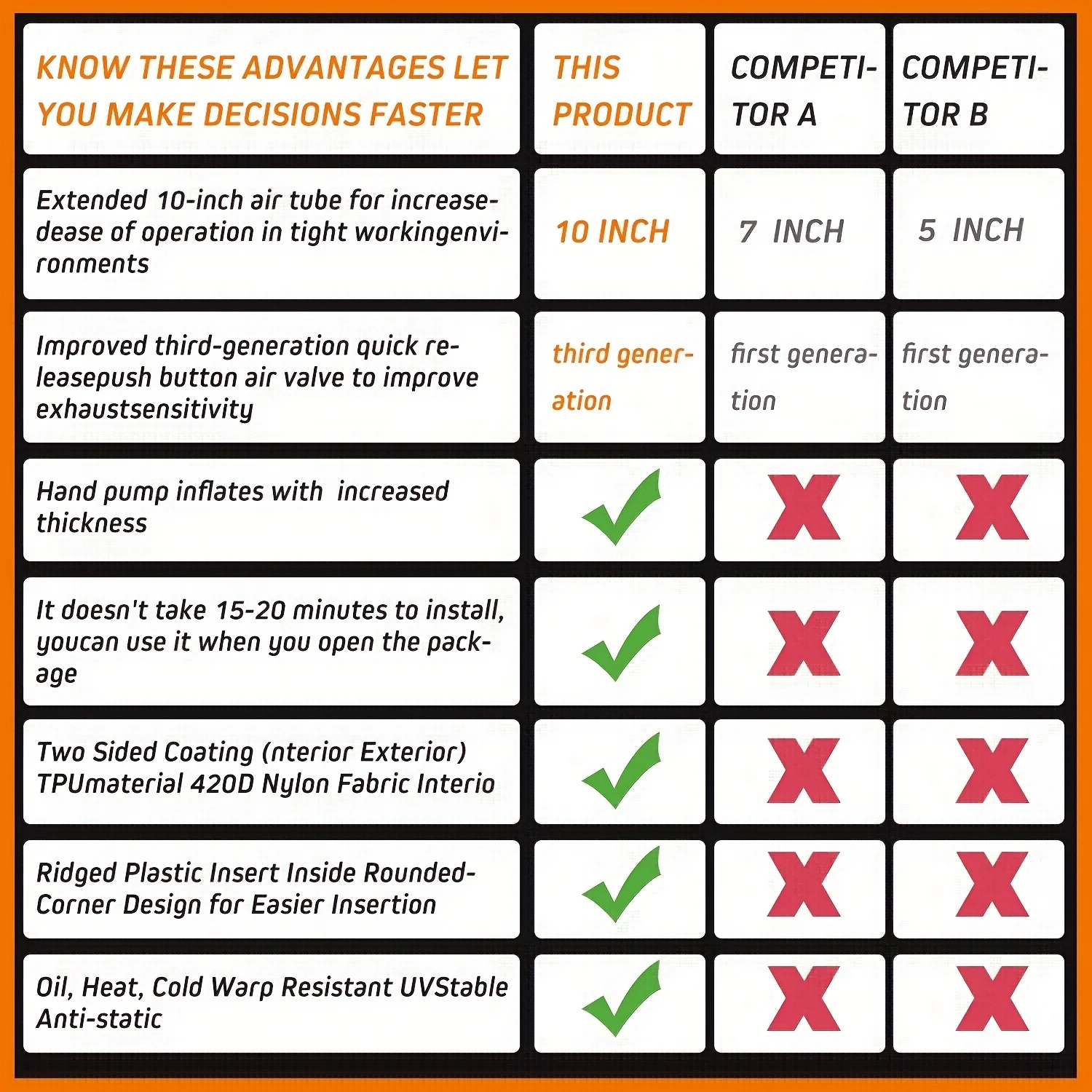 Imagine effortlessly leveling and aligning your vehicle with this professional-grade three-piece air wedge bag set. Crafted from industrial-strength materials, these inflatable shim bags are designed for heavy-duty applications, providing reliable assistance in vehicle maintenance, construction, or appliance installation. The sleek, matte black finish paired with bright orange labels ensures visibility and ease of identification during use. Each rectangle-shaped bag varies in size for versatility across multiple tasks. The set includes a high-capacity, efficient air pump with a hose to quickly inflate or deflate the bags, saving you time and effort. This kit offers durability, precision, and straightforward handling for demanding professional environments.
