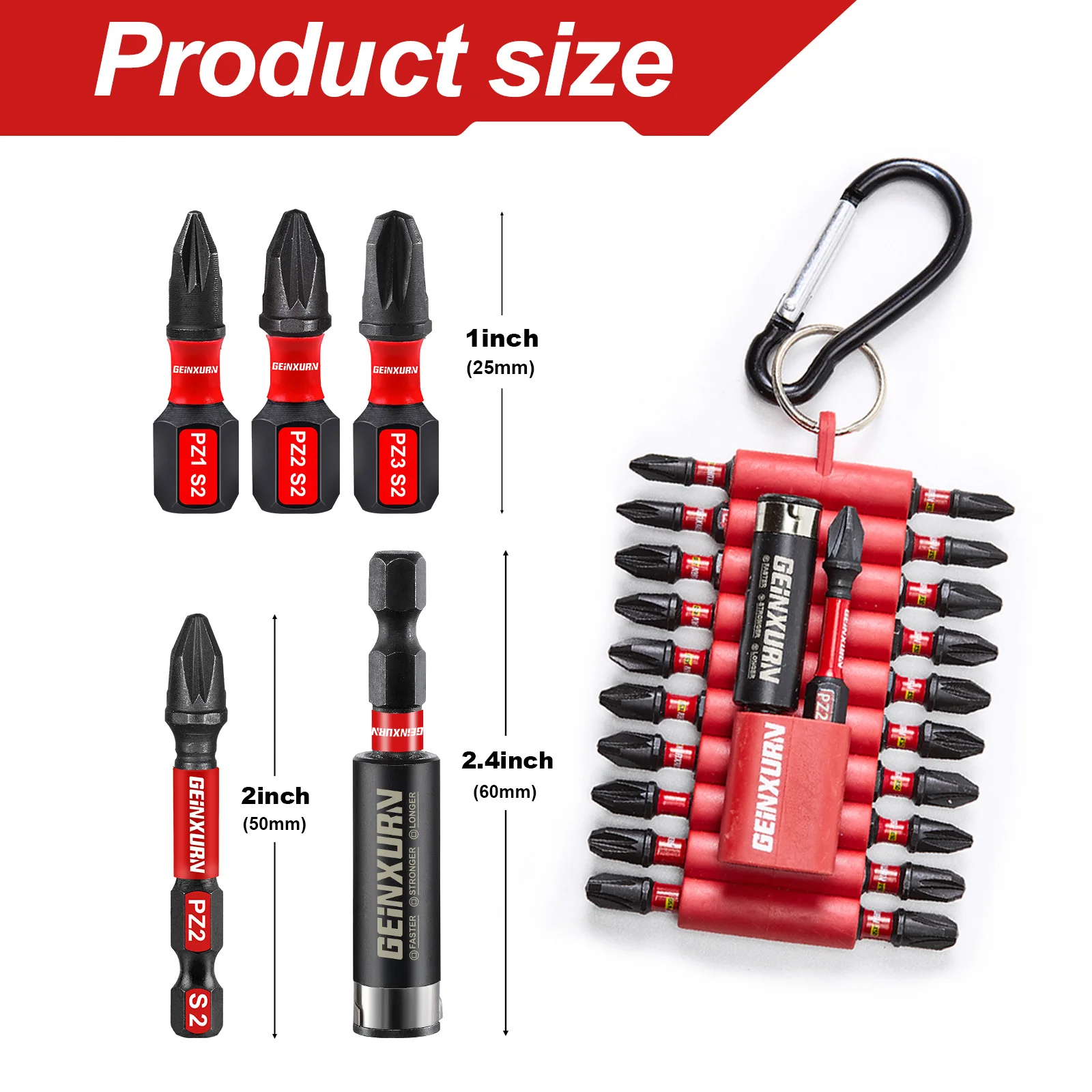 Transform your toolbox with this premium impact driver bit set. Crafted from high-hardness S2 alloy steel, these bits deliver exceptional durability, toughness, and resistance, perfect for heavy-duty industrial use. The set includes a versatile range of Pozidriv (PZ1, PZ2, PZ3) bits in various lengths—two 1-inch, six 2-inch, and two 2.4-inch bits—each designed for precise fit and maximum torque. The magnetized, dismountable screw heads help streamline your workflow, while the impact bit holder with an organizer sleeve ensures safe, convenient storage. The impact-resistant torsion zone absorbs peak torque, preventing breakage during demanding tasks. With a sleek black and red aesthetic, this set not only guarantees performance but also adds a professional touch to your toolkit. Trust in this set’s quality to handle any industrial project with confidence.