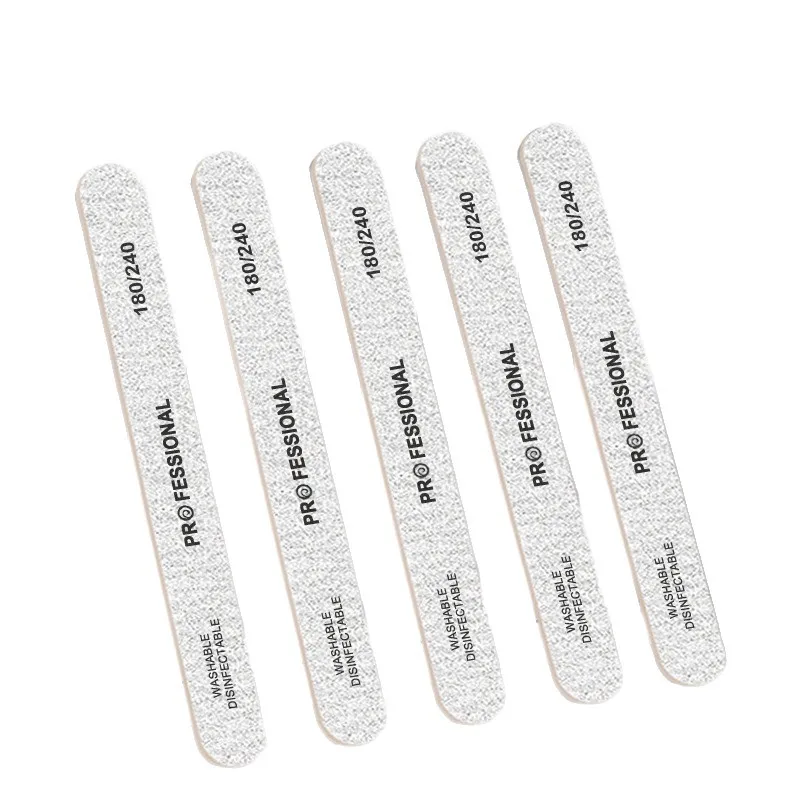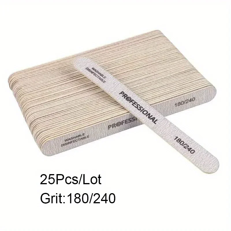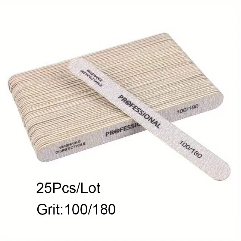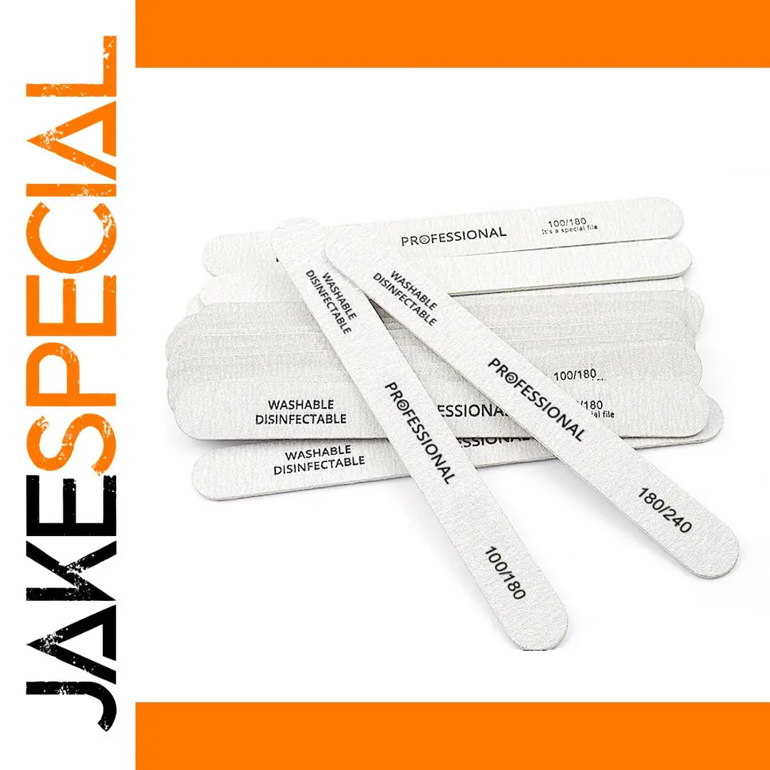 Enhance your nail care routine with this set of 10, 25, or 50 high-quality plastic nail files, available in grit options of 100/180 or 180/240. Designed with a sleek white finish and clear black labeling, these files feature a textured surface for precise filing and shaping. Perfect for pedicure, manicure, UV gel nail polish application, artificial tips, or professional nail care, they come with wooden sanding buffer blocks that ensure smooth, effective results. The rectangular shape with rounded edges offers comfort and control, making them an essential tool for both salon professionals and DIY enthusiasts seeking reliable, hygienic nail filing solutions.