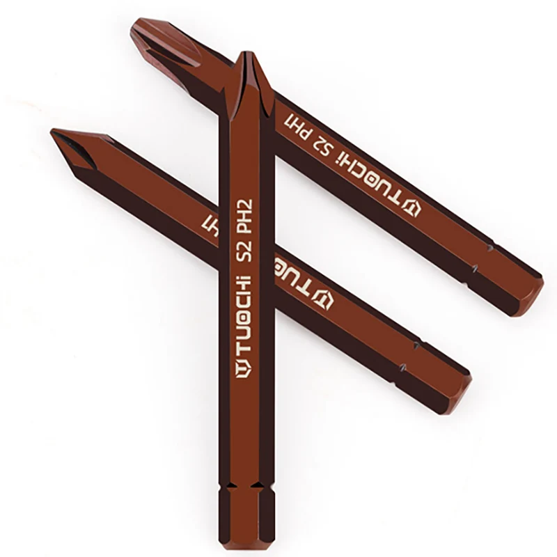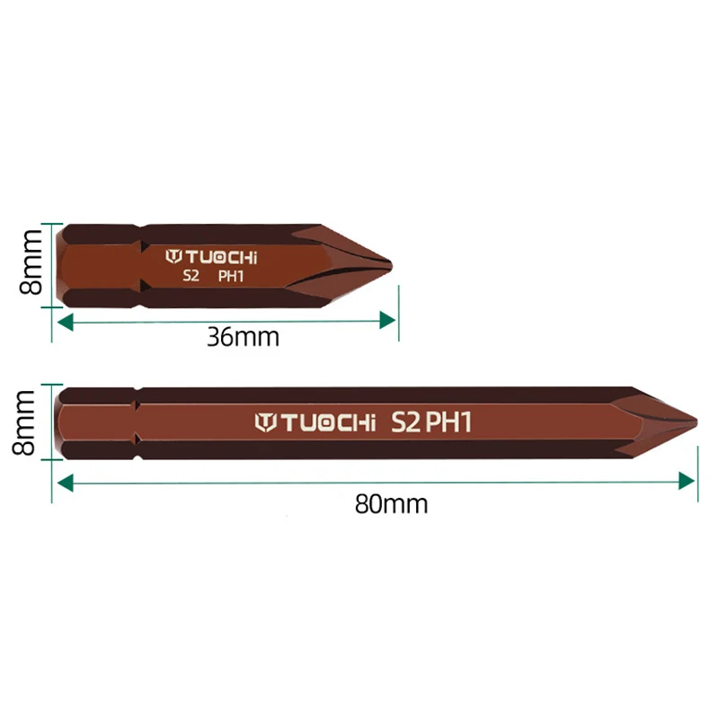 Experience the reliability and precision of this high-quality Phillips screwdriver bit set. Designed with professional craftsmanship, these bits are coated in a sleek, dark reddish-brown finish for enhanced durability and corrosion resistance. Featuring a magnetic head, they securely hold screws for efficient, one-handed operation. Crafted from premium S2 alloy, these bits guarantee high strength and longevity. Available in sizes PH1, PH2, and PH3, with lengths of 36mm and 80mm, they fit standard 8mm shank drives. Perfect for tasks requiring precision and resilience, this set is ideal for both professional and hobbyist projects, ensuring a smooth screwing experience every time.