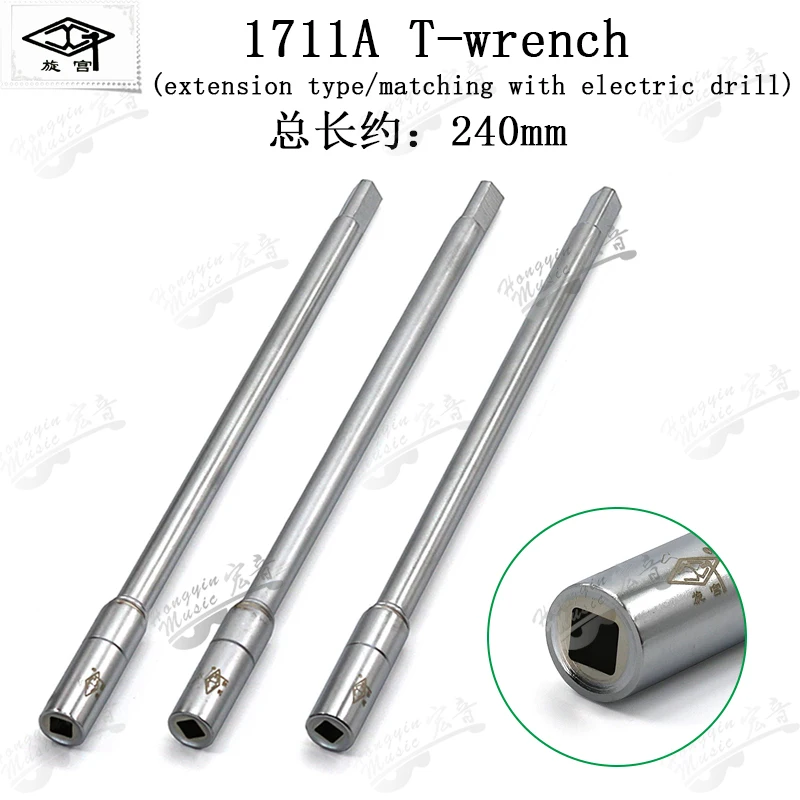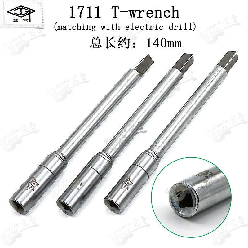 Experience the perfect blend of precision and elegance with this professional-grade piano maintenance tuner set. Crafted for expert technicians and dedicated enthusiasts, these tools feature polished metallic shafts paired with smooth, ergonomic wooden handles. The handles, made from rich rosewood and stained woods, provide a natural feel and outstanding durability, ensuring comfort during extended use. The set includes a variety of T-wrenches, such as the standard 1710, the versatile 1710A with a rosewood handle, the 1711 designed to work seamlessly with electric drills, the 1711A extension type also compatible with drills, and the 1855 extension T-wrench. Each piece’s aesthetic—shiny metal with warm wood finishes—exudes craftsmanship and professionalism. Invest in tools that enhance your mastery of piano tuning and maintenance, elevating your craftsmanship to a higher level.