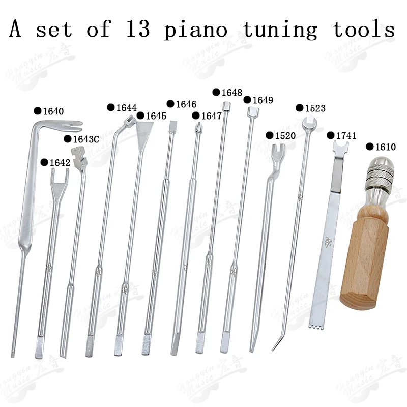 Enhance your piano repair toolkit with this professional set of 10 or 13 precision tuning and adjustment tools, crafted from durable brass and cupronickel. Featuring a variety of spanners including a spoon bender, bracket spanner, action regulator, damper regulator, upright flange spacer, and a spoon nail spanner, these tools are designed for meticulously fine adjustments. The sleek metallic finish and ergonomic design ensure durability and ease of use. Available in two sets labeled GQ1636 and GQ1637, with color variants for easy identification, this comprehensive toolkit is essential for serious piano technicians aiming for perfect sound and performance.
