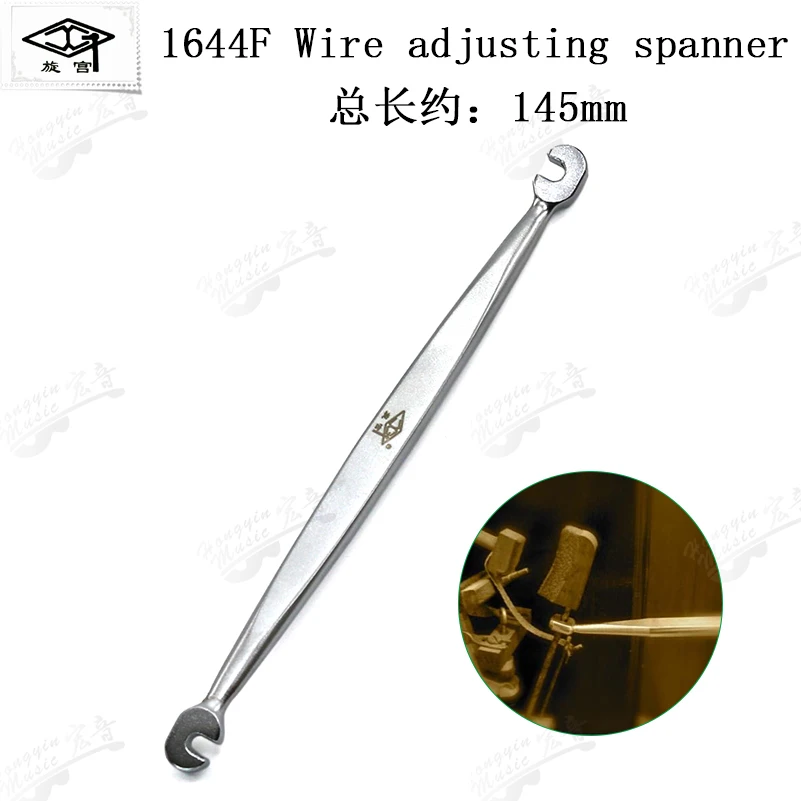 Discover the precision and durability of this professional-grade wire adjustment wrench, crafted specifically for fine-tuning piano strings. Made from high-quality brass and cupronickel, it offers exceptional resistance to wear while maintaining a sleek, metallic finish. Available in two models, GQ1644F and GQ1652, each designed for specific tuning needs, these tools embody exceptional craftsmanship. The GQ1644F model features a slender, tapered handle with crescent-shaped hooks at each end for delicate adjustments, while the GQ1652 model boasts a robust, rectangular profile with an L-shaped bend for extra leverage and a flat tip for precise torque application. These tools are essential for professional piano repair, offering unmatched control and reliability during tuning tasks.