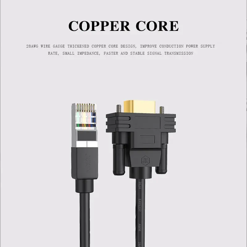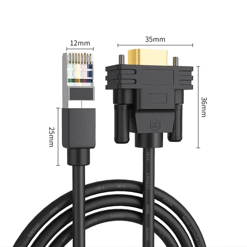 Experience reliable connections with this high-quality RJ45 to DB9 console cable. Designed for seamless serial communication, it’s perfect for managing Cisco routers, switches, and other network equipment. The cable’s black outer jacket offers durability and a professional look. On one end, you'll find a robust black rectangular DB9 male connector with a yellow faceplate, gold-plated pins, embossed “DIVEDEER” branding, and ridged housing for secure attachment. The opposite end features a transparent RJ45 connector, allowing you to view the internal wiring, which ensures precise and stable data transfers. Available in lengths of 1.5 meters, 3 meters, and 5 meters, it provides flexibility for your setup. Its rugged design guarantees long-lasting performance in technical environments, making it an indispensable accessory for network administrators and IT professionals.
