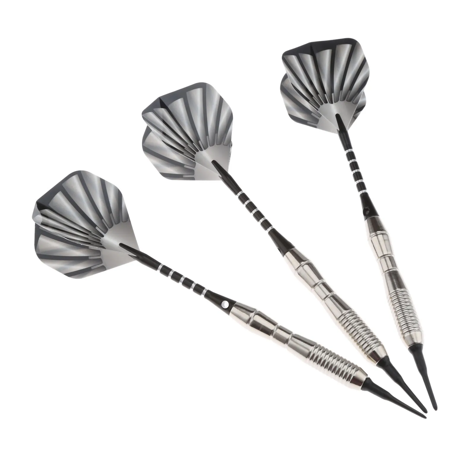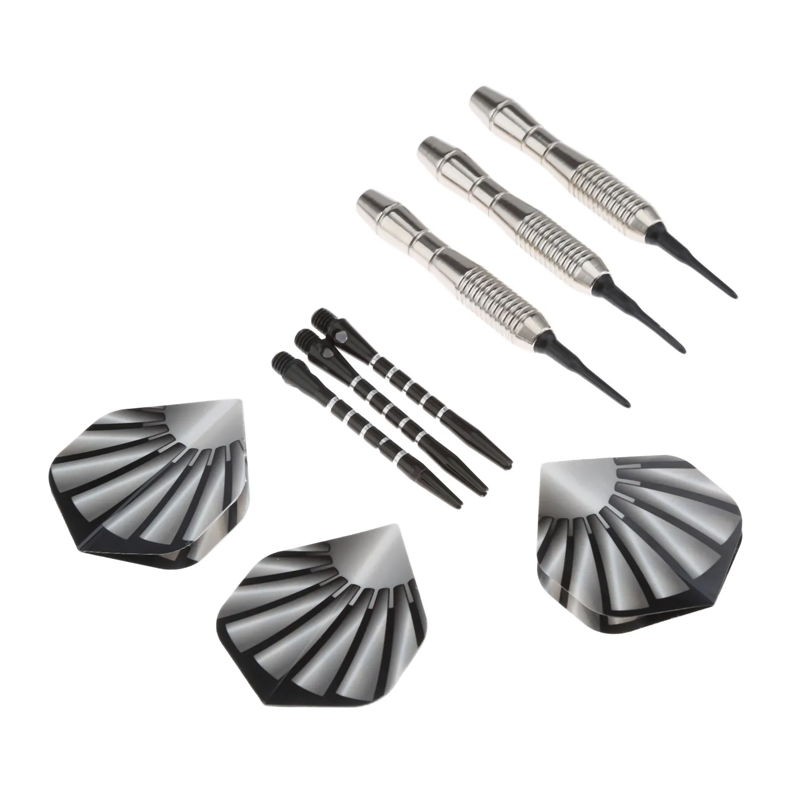 Imagine enhancing your dart game with this sleek and stylish set of three professional soft tip darts. Designed for precision and durability, each dart measures approximately 158mm (6.22″) with a 9mm steel barrel that offers a comfortable grip. The polished, metallic finish of the barrels adds a modern, sophisticated look. The lightweight aluminum shafts feature black and silver striped patterns, providing both aesthetic appeal and a firm hold during play. The high-quality flights showcase an angular, starburst design in black and silver, ensuring stability and visual flair. Perfect for electronic dartboards, this set elevates your casual or competitive games, making every throw a confident shot. You’ll enjoy the perfect blend of style and function every time you play.