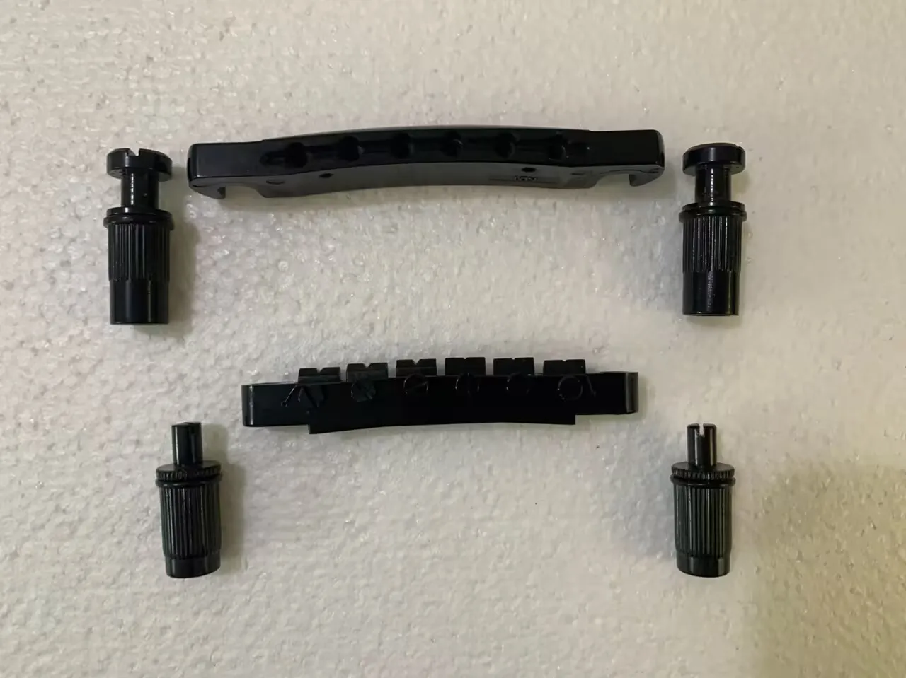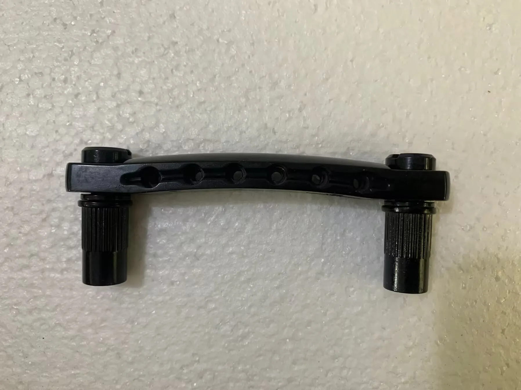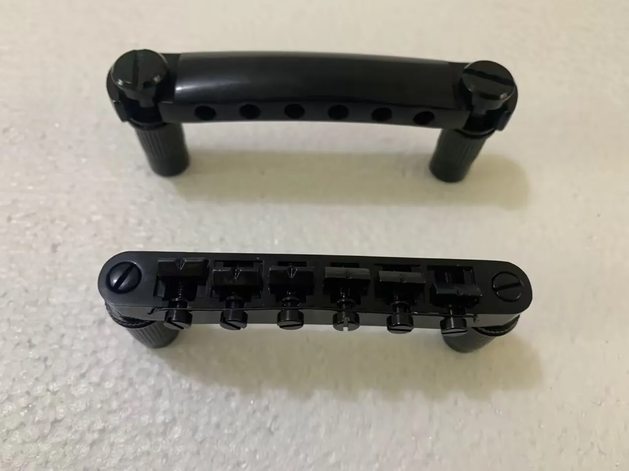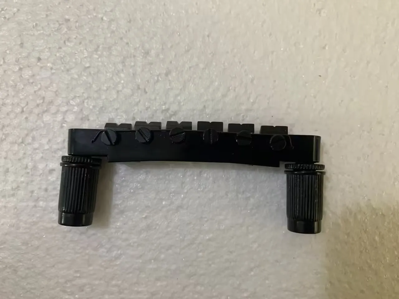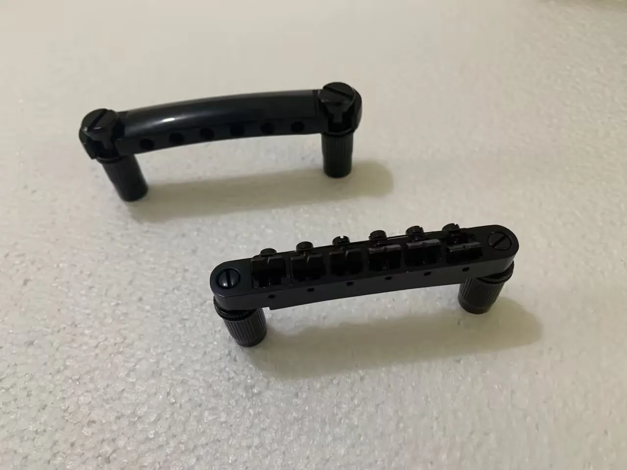 Enhance your 6-string electric guitar with this professional Tone-O-Matic bridge, crafted for DIY installation. Featuring a sleek black design with a glossy, polished finish, it combines durability with an industrial aesthetic. The sturdy rectangular bases include precise cutouts and mounting points for secure attachment, while the textured support posts with vertical ridges provide a rugged grip. Designed for compatibility with standard electric guitars, this component offers a robust and functional upgrade that reinforces your instrument’s modern style and reliable performance. Easy to install, it’s an excellent choice for guitar enthusiasts seeking quality hardware to customize their instrument.