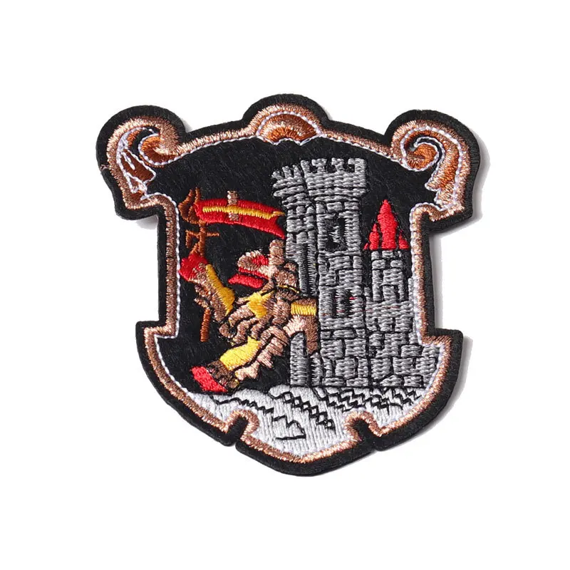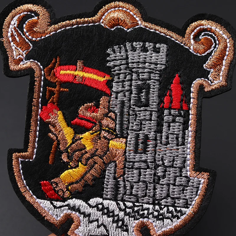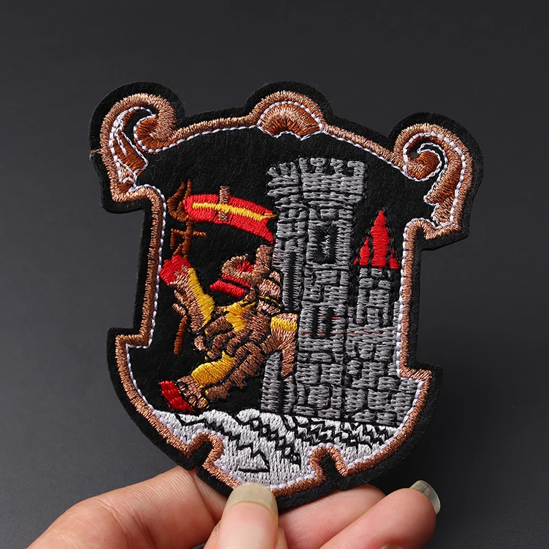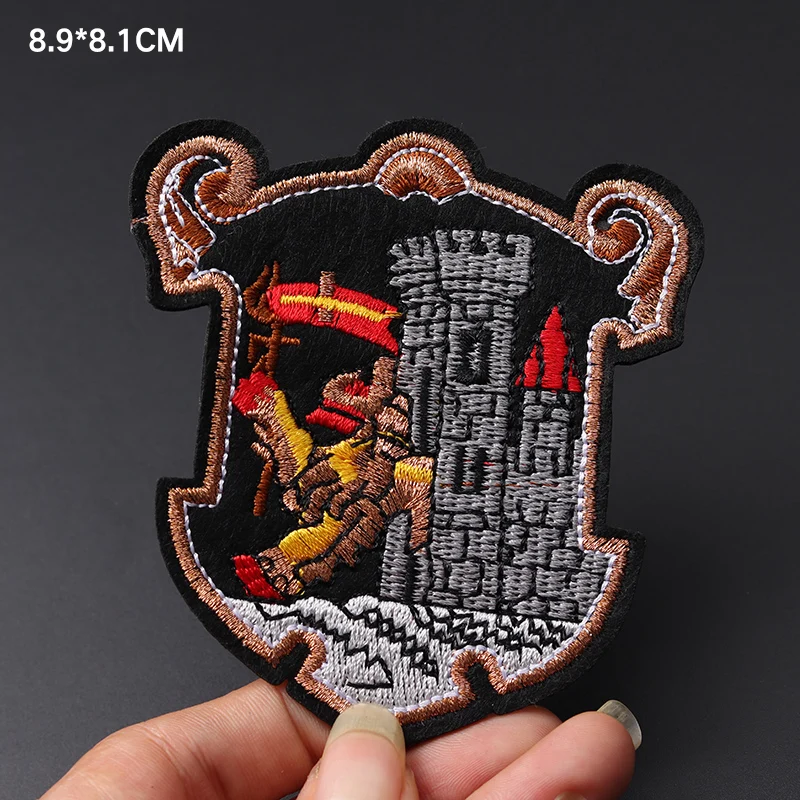 This beautifully crafted embroidered decorative patch measures 8.9 cm by 8.1 cm and showcases an enchanting design featuring a majestic castle and a dynamic knight. Made from high-quality non-woven fabric, this patch is not only visually stunning with its gray stone textures and rich red accents but is also highly practical with an iron-on style for easy application on any garment. The intricate detailing, such as the vivid colors of yellow, red, and brown in the knight's attire, immerses you in a world of imagination. Enhance your clothing or accessories with this unique piece that speaks to your adventurous spirit.