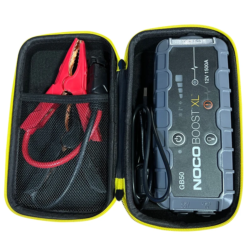 Discover the ultimate ease and confidence with this specially designed protective case for the NOCO Boost XL GB50 1500 Amp 12-Volt UltraSafe Lithium Jump Starter. Crafted from durable EVA material, it offers waterproof, anti-knock, and heavy-duty protection to keep your device secure during travels. The sleek black exterior is accented with a striking yellow and black two-tone zipper, adding both style and functionality. The case measures approximately 230mm x 140mm x 75mm, perfectly fitting your jump starter and accessories. Its shockproof and portable design ensures your device is protected from impacts and environmental elements. Whether you're heading outdoors or storing in your vehicle, this case maintains your equipment’s safety and readiness at all times.