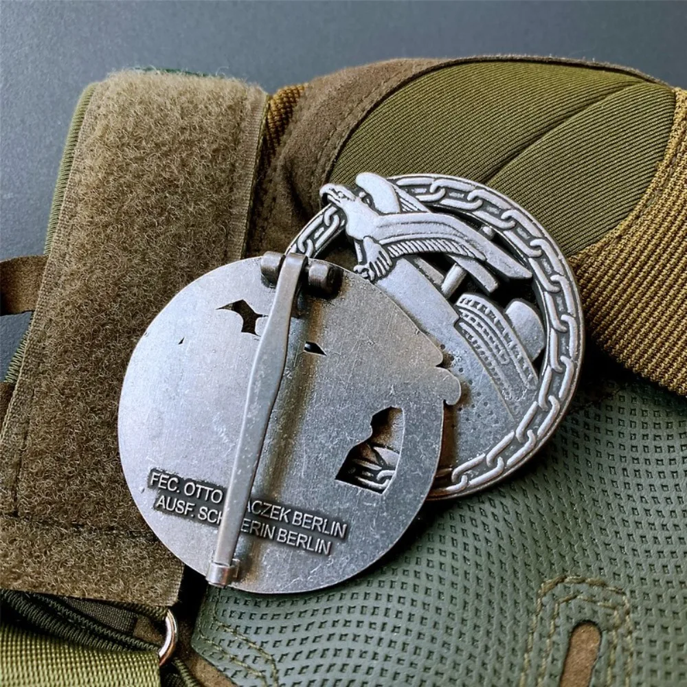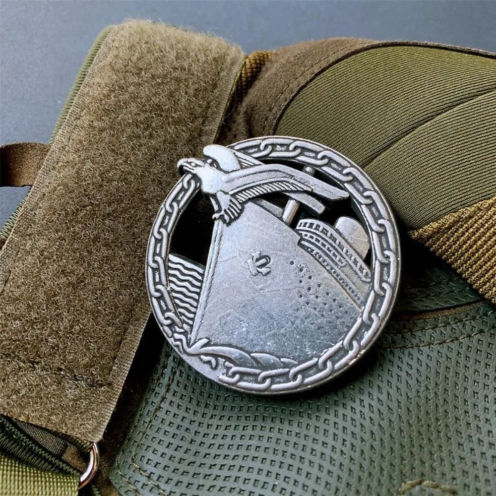 This stunning 3D metal badge reflects a vintage and patriotic Prussian sea theme, measuring approximately 5.1 cm in height and 4.9 cm in width. Crafted from durable alloy, its silver finish showcases intricate designs of a stylized ship navigating waves, with an eagle soaring above. The detailed border resembles a chain or rope, enhancing its nautical aesthetic. Suitable for both men and women, this badge can be applied to jackets, backpacks, hats, or DIY clothing projects. Embrace the retro, military spirit with this unique accessory that adds character and style to any ensemble.