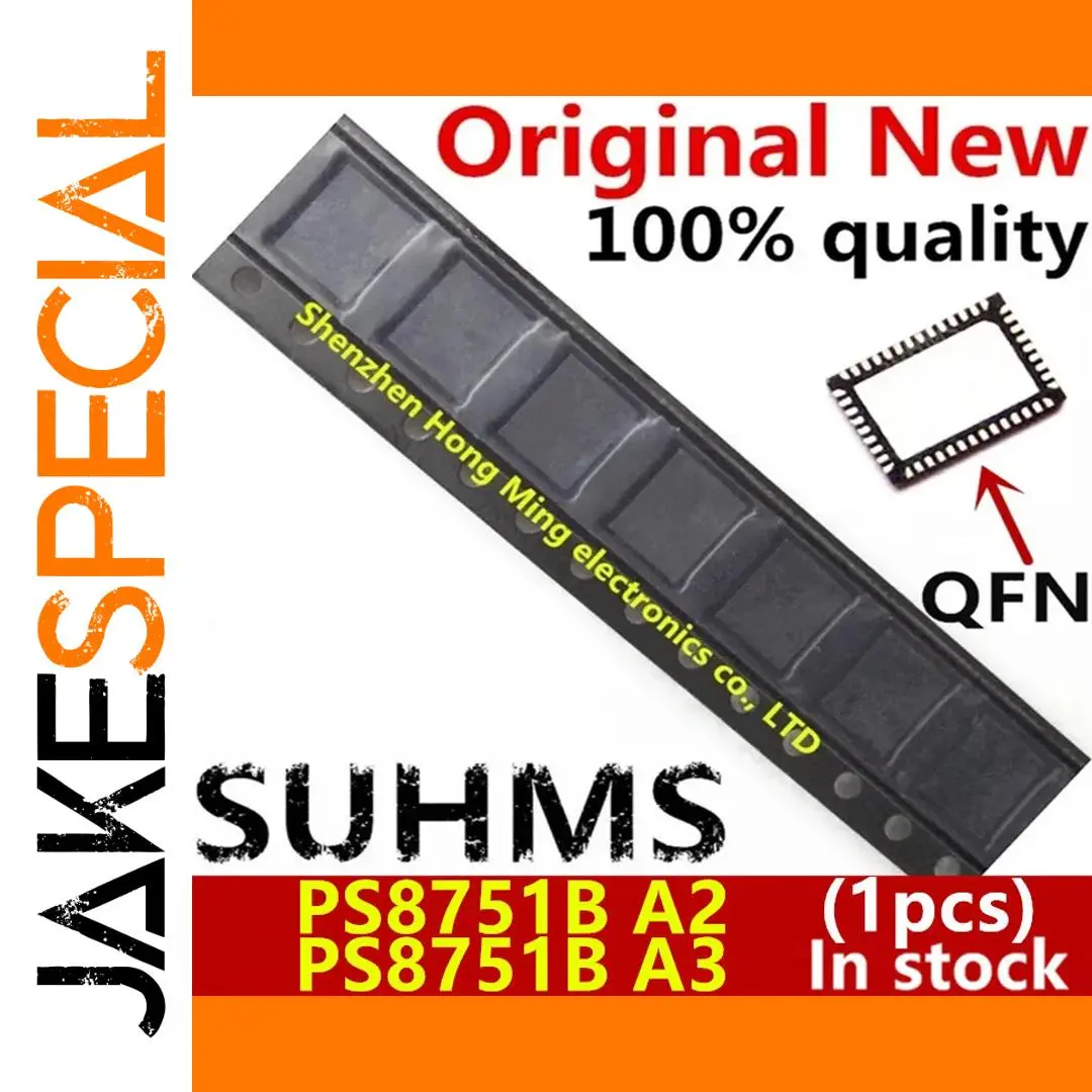 Experience premium quality with this original drive IC chip, featuring a sleek black QFN-52 package designed for optimal performance in computer applications. Its compact, rectangular body boasts a smooth matte finish, exuding a modern, professional aesthetic. The chip is available in two color variants, PS8751B A2 and PS8751B A3, matching different technical specifications. With precisely spaced metallic pins along its perimeter, the design ensures reliable connections and easy installation. This product emphasizes authenticity and high standards, making it a trustworthy choice for your electronic projects. Its durable construction supports continuous operation, meeting international electrical standards and operating within safe temperature ranges. Elevate your device's functionality with this dependable, high-quality component.