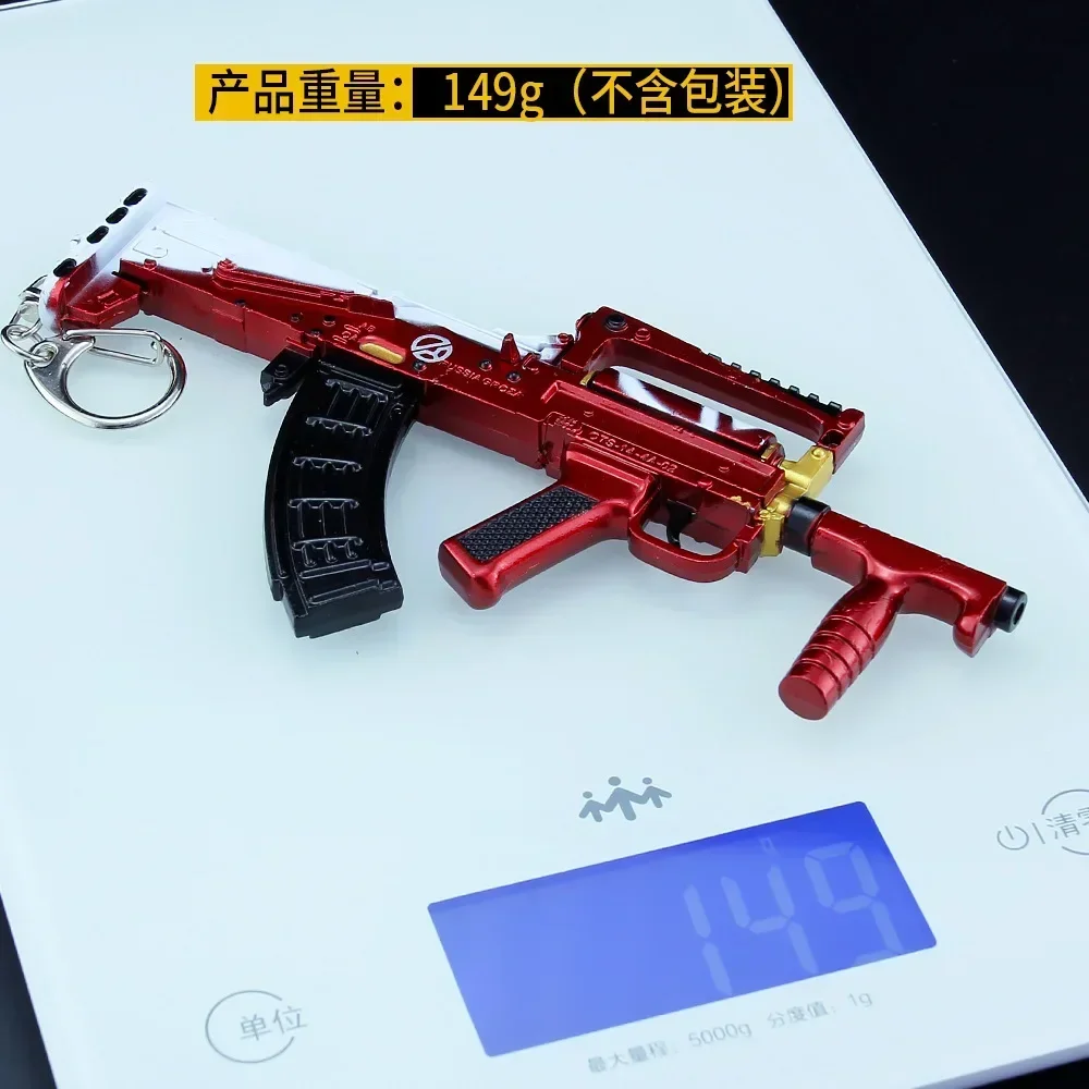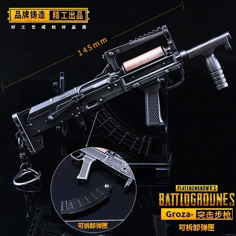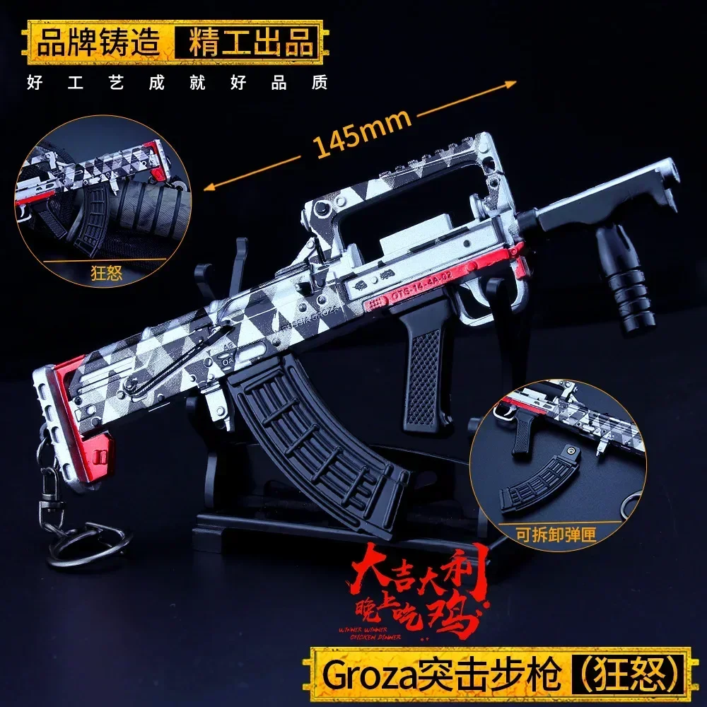 Experience the thrill of owning a miniature version of the iconic GROZA from PlayerUnknown's Battlegrounds with this meticulously crafted 14.5cm metal model. Made from durable zinc alloy with a shiny electroplated finish, it captures realistic details such as the barrel, stock, and trigger. The eye-catching blue and black accents, along with fine shading, add depth and a vibrant, stylized aesthetic. Its retro, nostalgic design combines classic and modern influences, making it a perfect collectible or decorative item. Weighing only 150 grams, this lightweight model is easy to carry or display, bringing a touch of gaming excitement to your collection. Its detailed craftsmanship ensures it stands out whether used as a keychain or a display ornament for fans of PUBG.